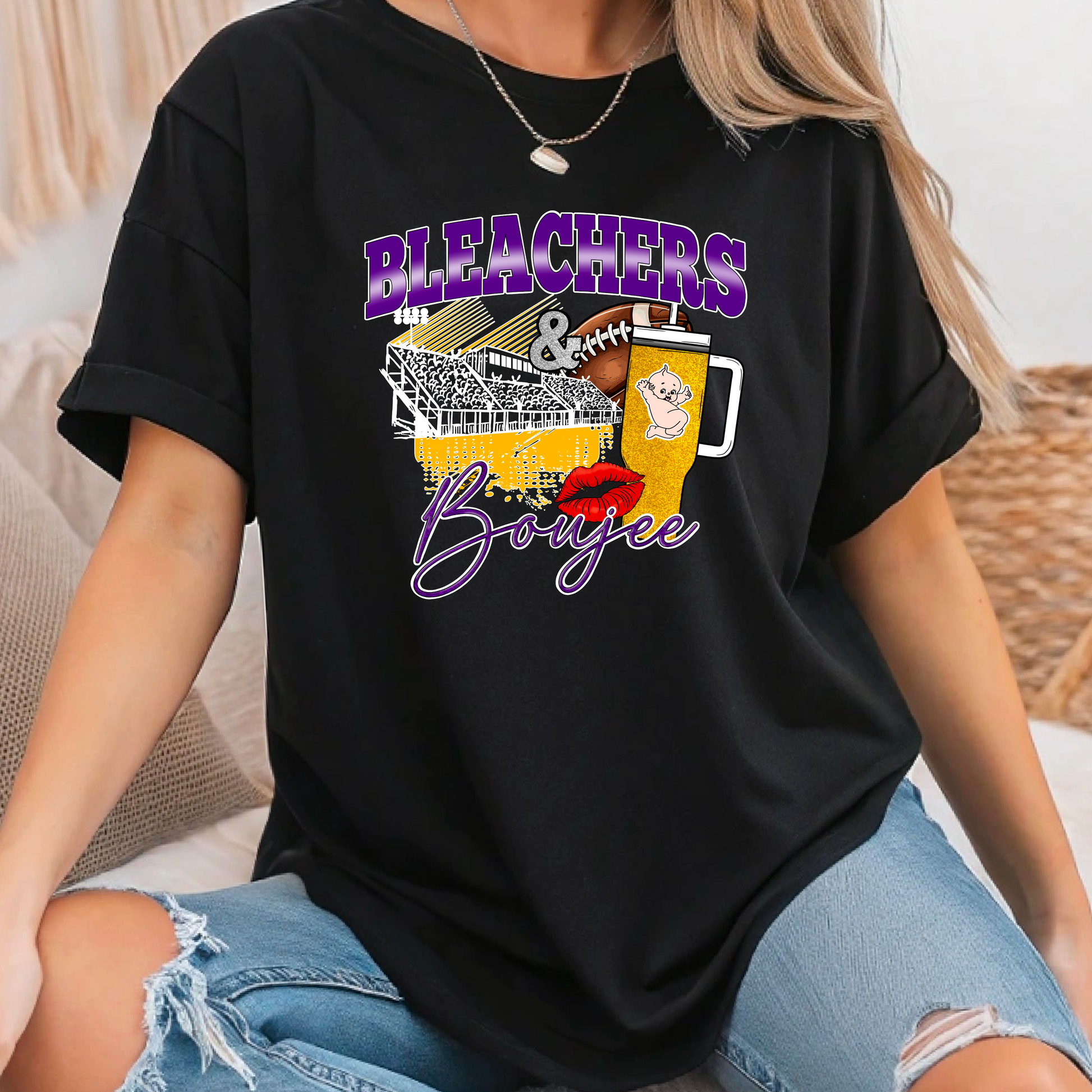 Represent your team with glam in the Kewpies edition of our bestselling “Bleachers & Boujee” shirt! Featuring a packed stadium, football, kiss mark, glittery drink tumbler, and an adorable Kewpie mascot—this tee blends sporty sass with school pride.