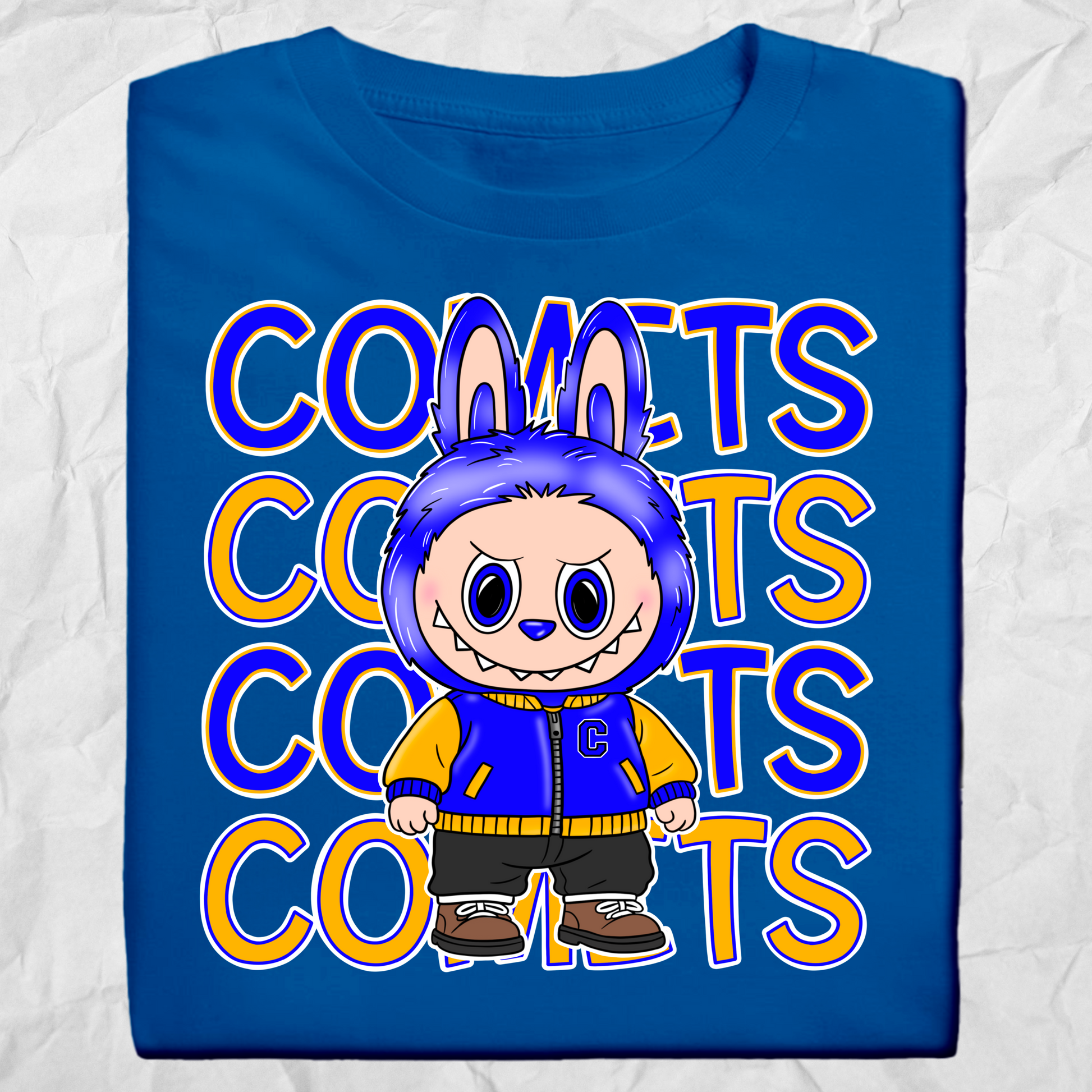 Show off your school pride with this bold Comets tee! Featuring a playful blue monster mascot in a varsity jacket and layered “COMETS” text in bright blue, gold, and white, this tee is a perfect spirit wear staple for fans, students, and families alike. Fun, fierce, and full of team pride!