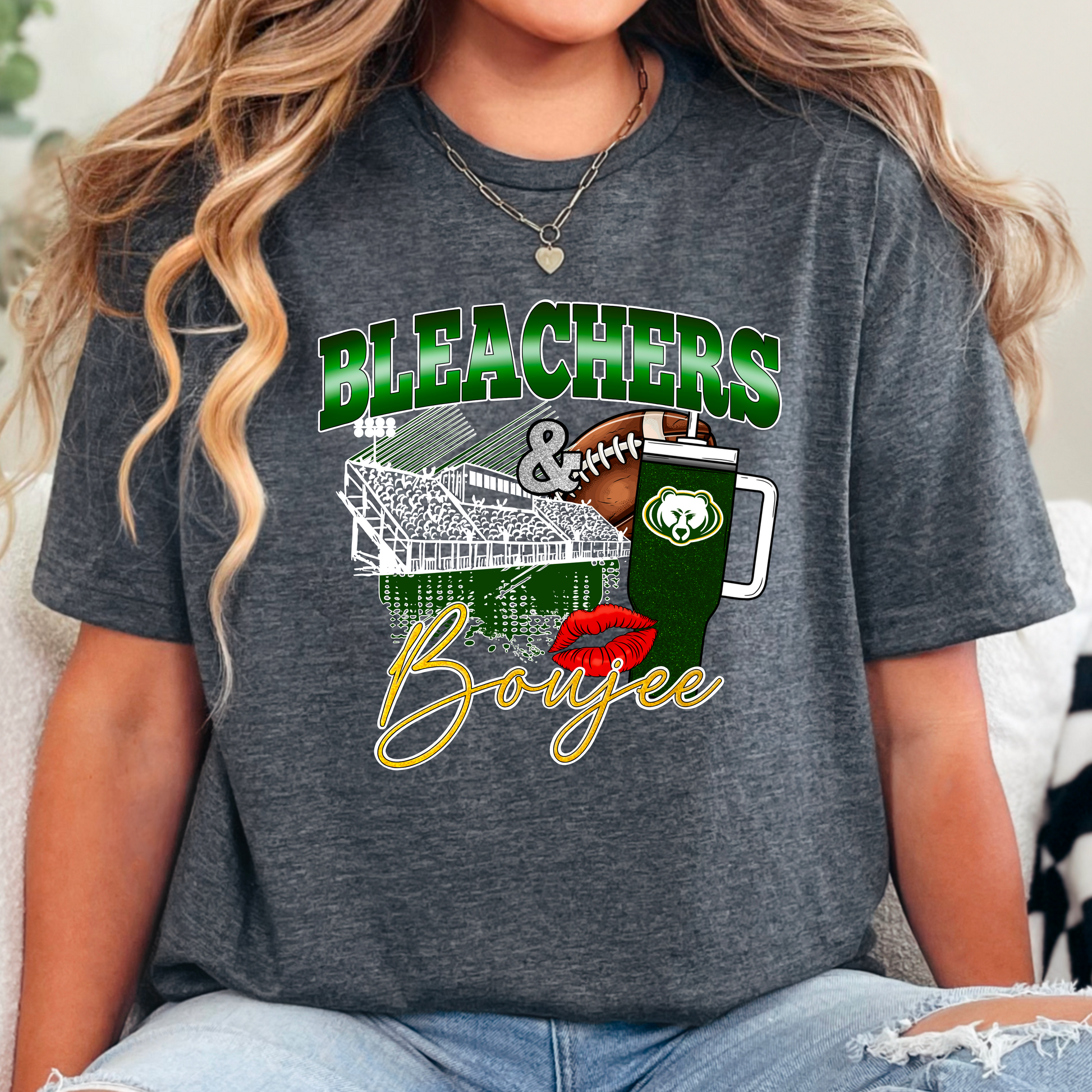 This “Bleachers & Boujee” PNG design in bold green and yellow is perfect for showing off your Bruins pride with a glam twist! Featuring a football stadium, lipstick kiss, and glitter-style tumbler with a bear mascot, it’s great for custom shirts, tumblers, and more.