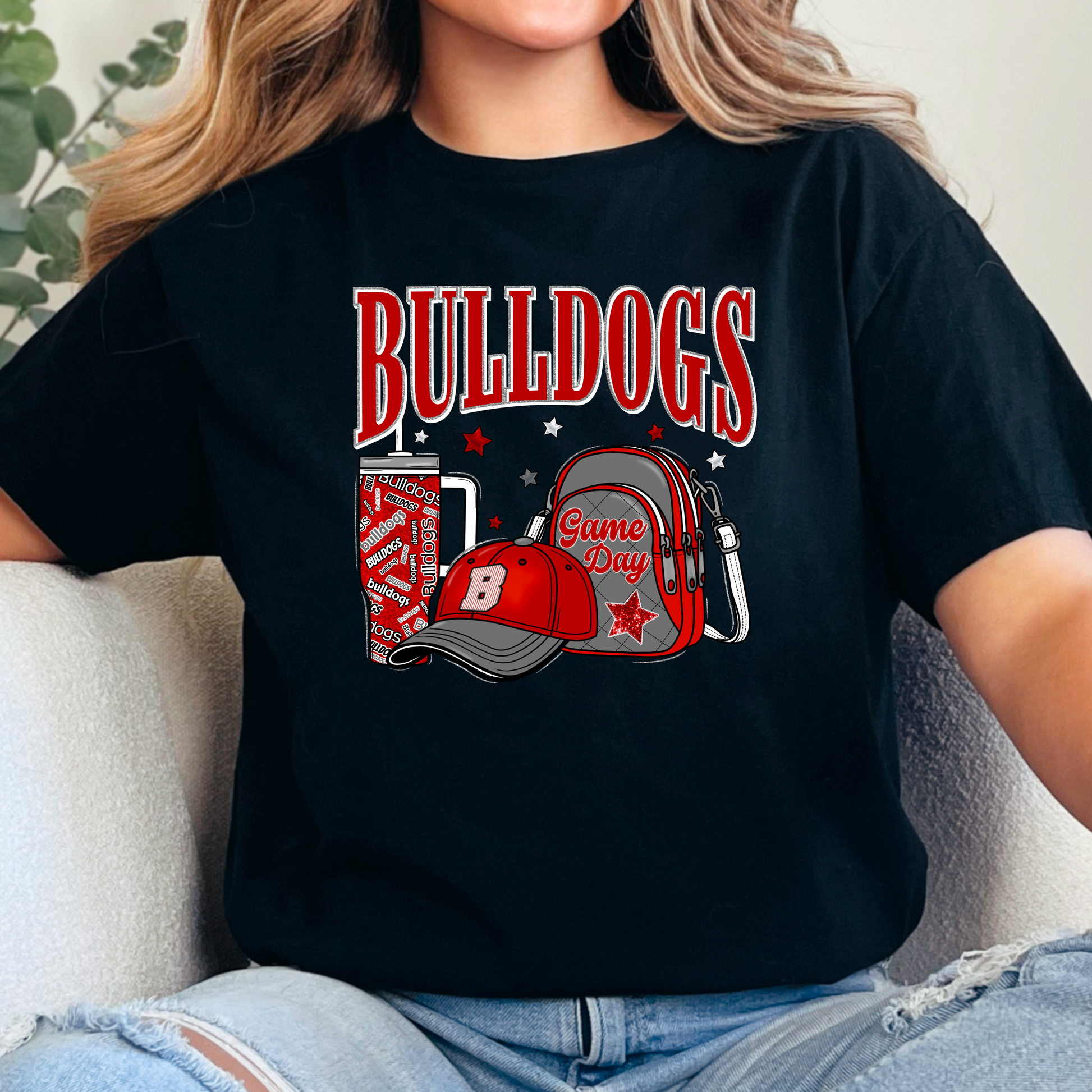 Bring the energy in this bold Bulldogs Game Day tee! Featuring red and black team gear graphics—from the backpack to the cap and cup—this shirt is perfect for showing off your school pride in style. Whether you're cheering from the sidelines or tailgating, you'll be ready to rep your team!