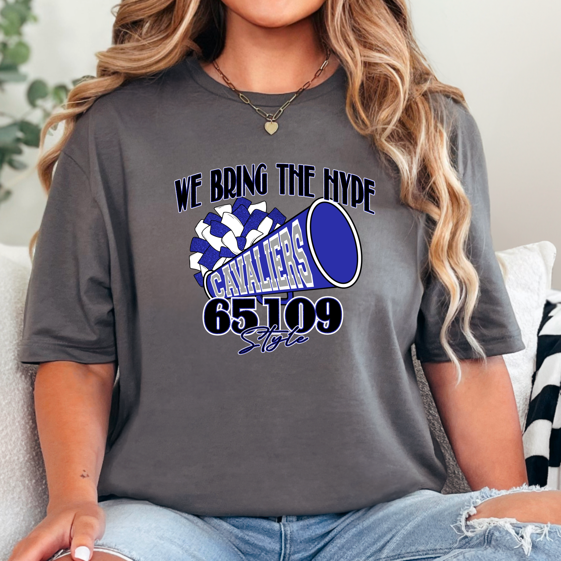 This Cavaliers tee is made for spirited fans and cheer mamas who show up loud and proud! Featuring a bold megaphone, stacked bows, and custom ZIP code 65109, this shirt captures all the local team love in vibrant blue and white.