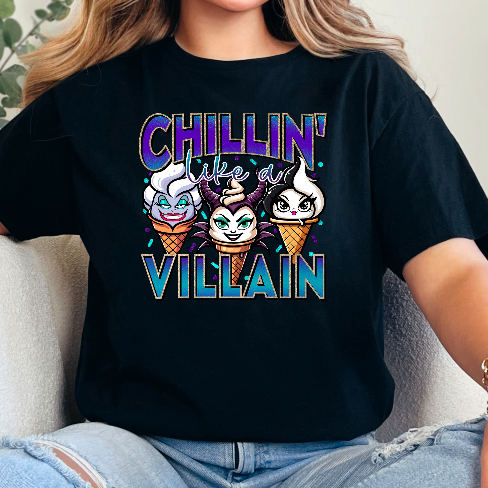 Embrace your inner baddie with our Chillin' Like a Villain graphic tee! Featuring your favorite iconic villain-inspired ice cream cones, this shirt is the perfect blend of wickedly cool and sweetly sassy.
