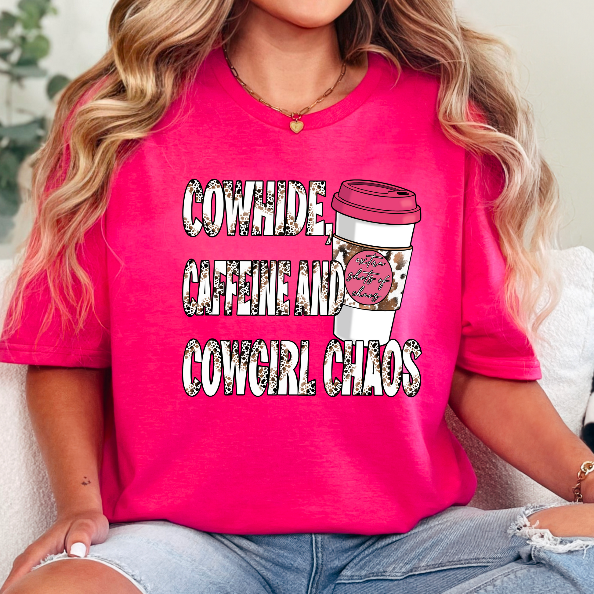 Embrace the chaos with this Cowhide, Caffeine and Cowgirl Chaos digital design! Featuring a bold cowhide print, fun western lettering, and a trendy coffee cup graphic, this high-quality PNG file is perfect for sublimation printing, DTF transfers, t-shirts, mugs, tumblers, signs, and more. Designed for cowgirls, rodeo lovers, and western fashion fans who love a little coffee with their chaos.