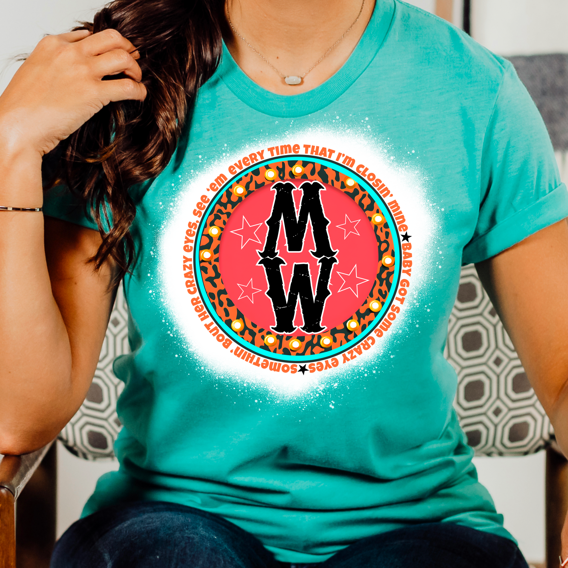 Turn heads in this bold Crazy Eyes tee featuring a wild leopard border and western MW monogram. The vibrant design pops on a turquoise tee, complete with a playful lyric wrap: “Baby got some crazy eyes… something 'bout her crazy eyes.” A must-have for your rodeo season or everyday sass!