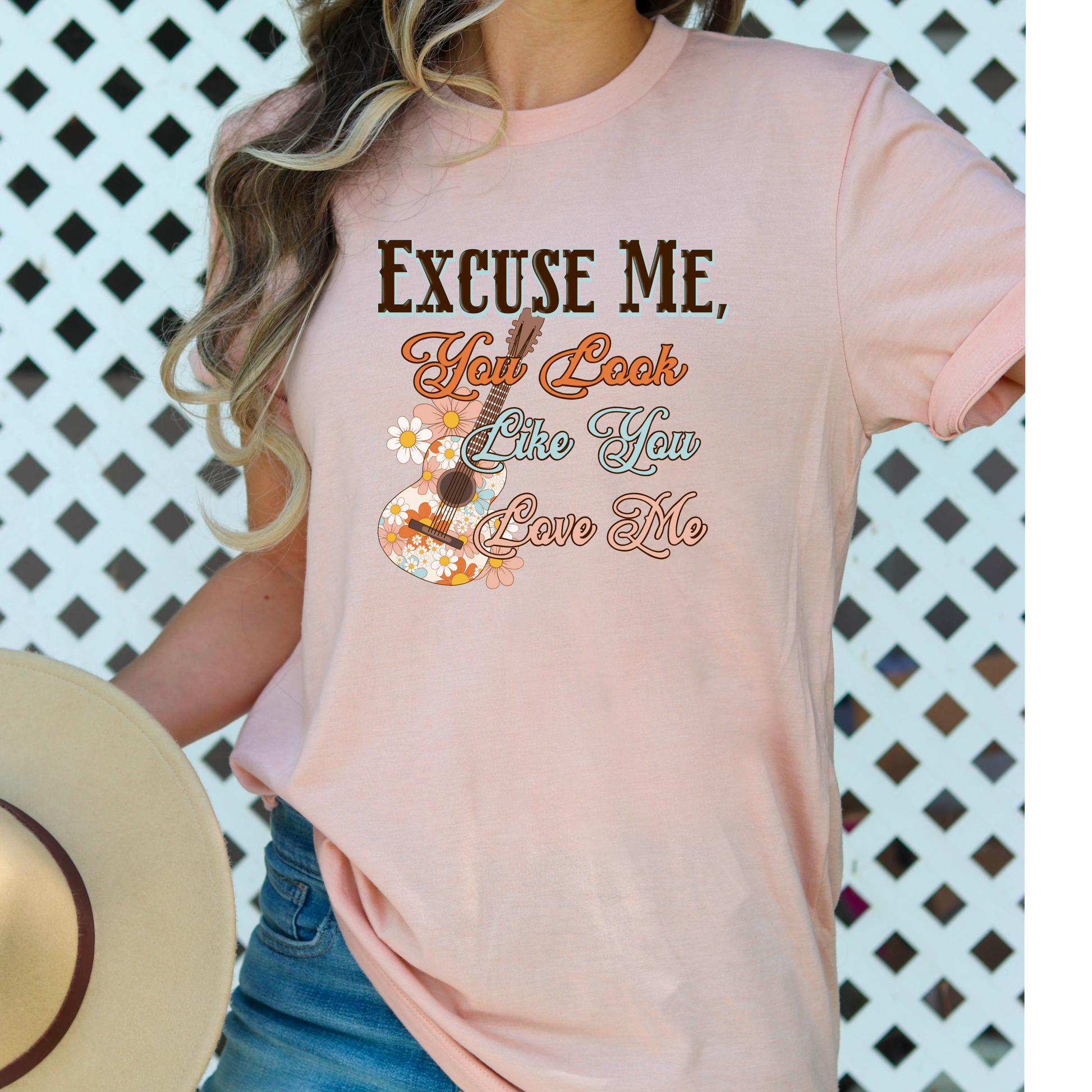 Add a retro western vibe to your wardrobe with this Excuse Me, You Look Like You Love Me graphic tee! Featuring playful fonts and a floral guitar design, this country-inspired t-shirt is perfect for cowgirls, country concerts, rodeo weekends, and western boutique fashion lovers. A fun blend of vintage style and country charm.