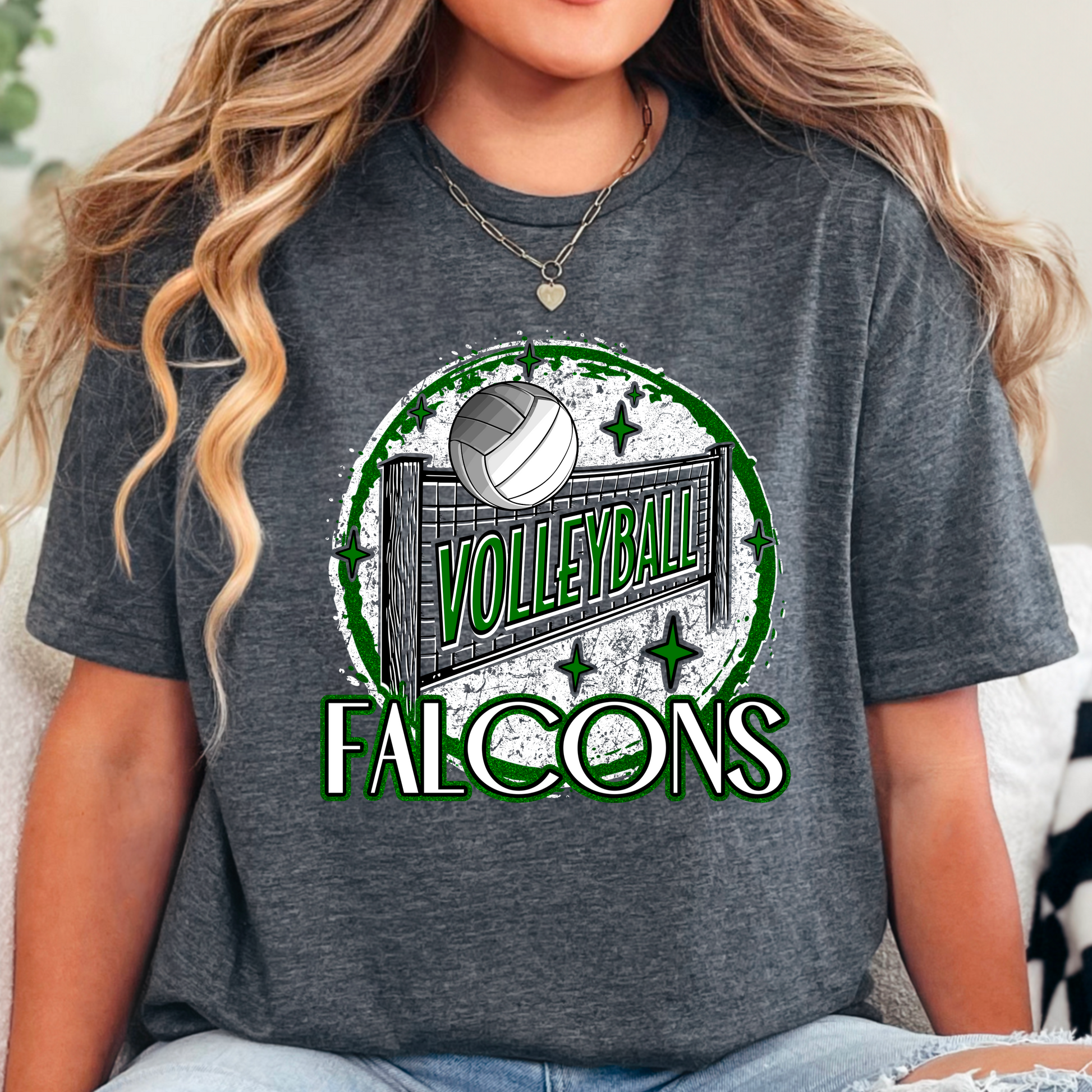 Show your team pride with this Falcons Volleyball tee in bold green! With a grunge net and starburst design, it’s the perfect shirt for game days, school spirit events, and volleyball fans who love to stand out.