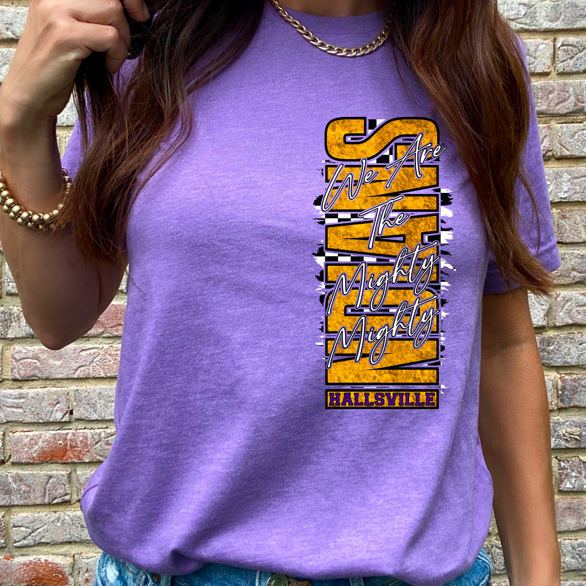 Cheer on the Hallsville Indians in this eye-catching purple tee! Featuring stacked “INDIANS” lettering in bold gold, distressed brushstroke accents, and “We Are the Mighty Mighty” script overlay, this design makes a vibrant statement. Perfect for game days, school pride events, or everyday wear—show your Hallsville spirit loud and proud!