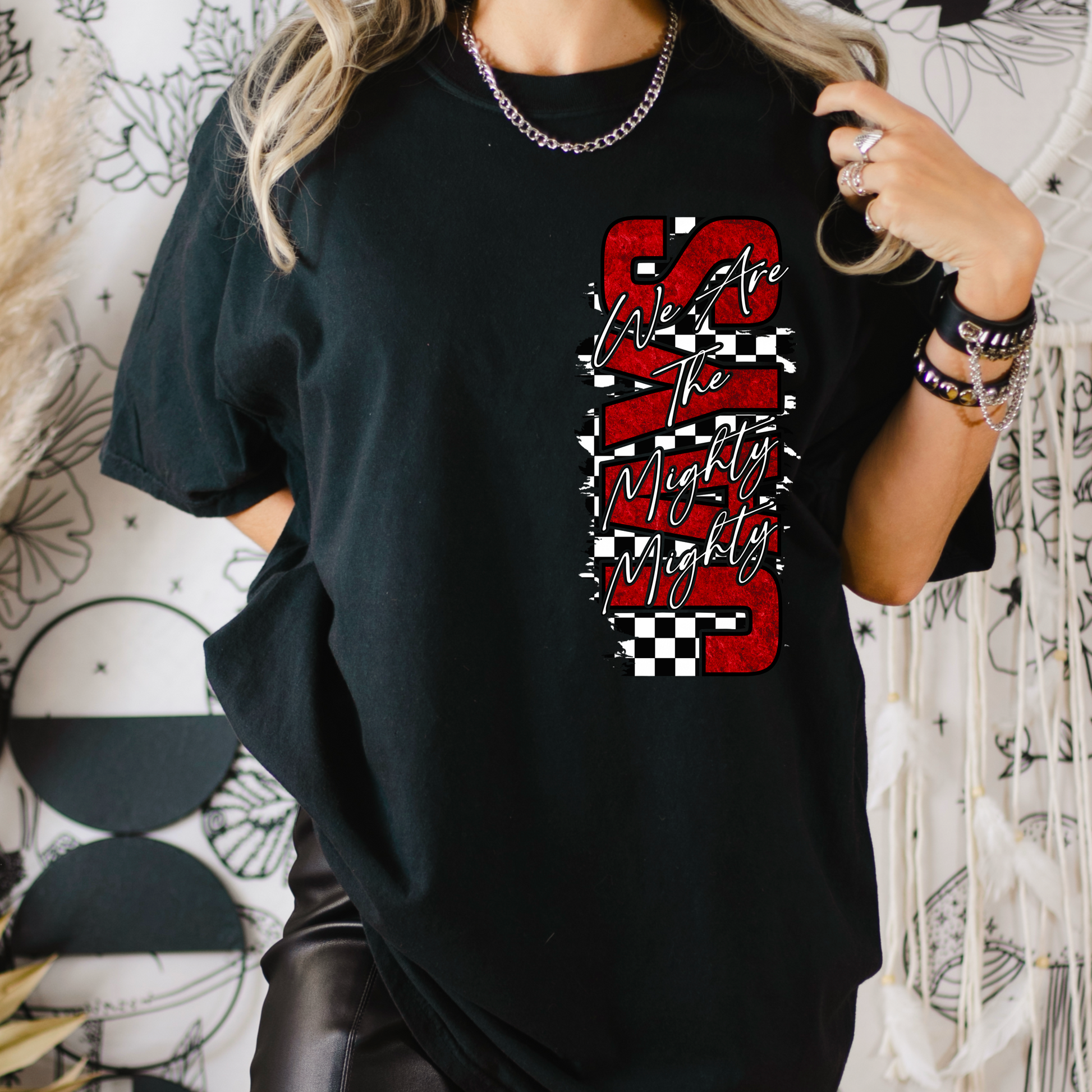 Bring the energy in this bold Mighty Jays t-shirt! Featuring stacked red “JAYS” lettering with checkered accents and a sleek “We Are the Mighty Mighty” script overlay, this design pops against a solid black tee. Perfect for pep rallies, school events, or everyday pride—this tee is made for fans who stand out!