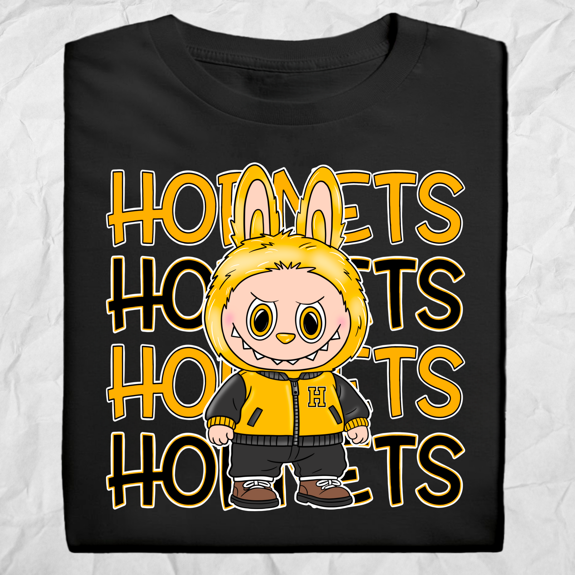 Buzz with pride in this bold Hornets tee! Featuring a yellow monster mascot in a varsity “H” jacket, this shirt makes school spirit fun and fierce. The layered “HORNETS” lettering adds extra impact, perfect for students, athletes, or fans ready to show off their hive energy!