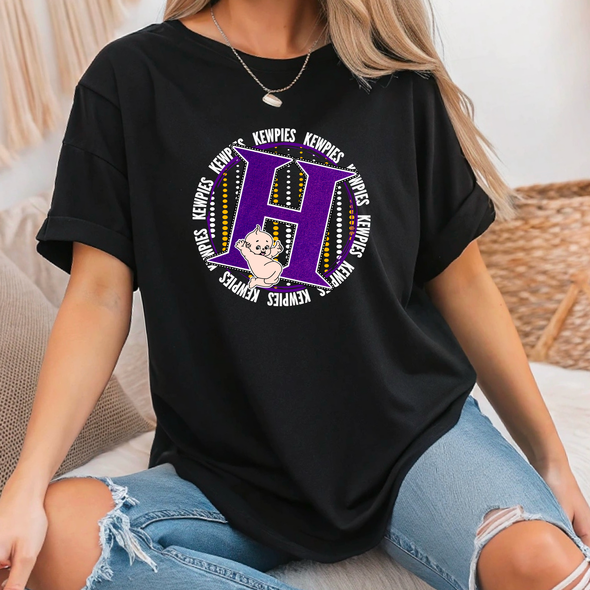 Rep your team in vintage style with this bold purple “H” Kewpies Patch Tee! Featuring classic dot accents and the iconic Kewpie mascot, this soft black tee is perfect for school spirit days, game nights, or showing love for your hometown crew.