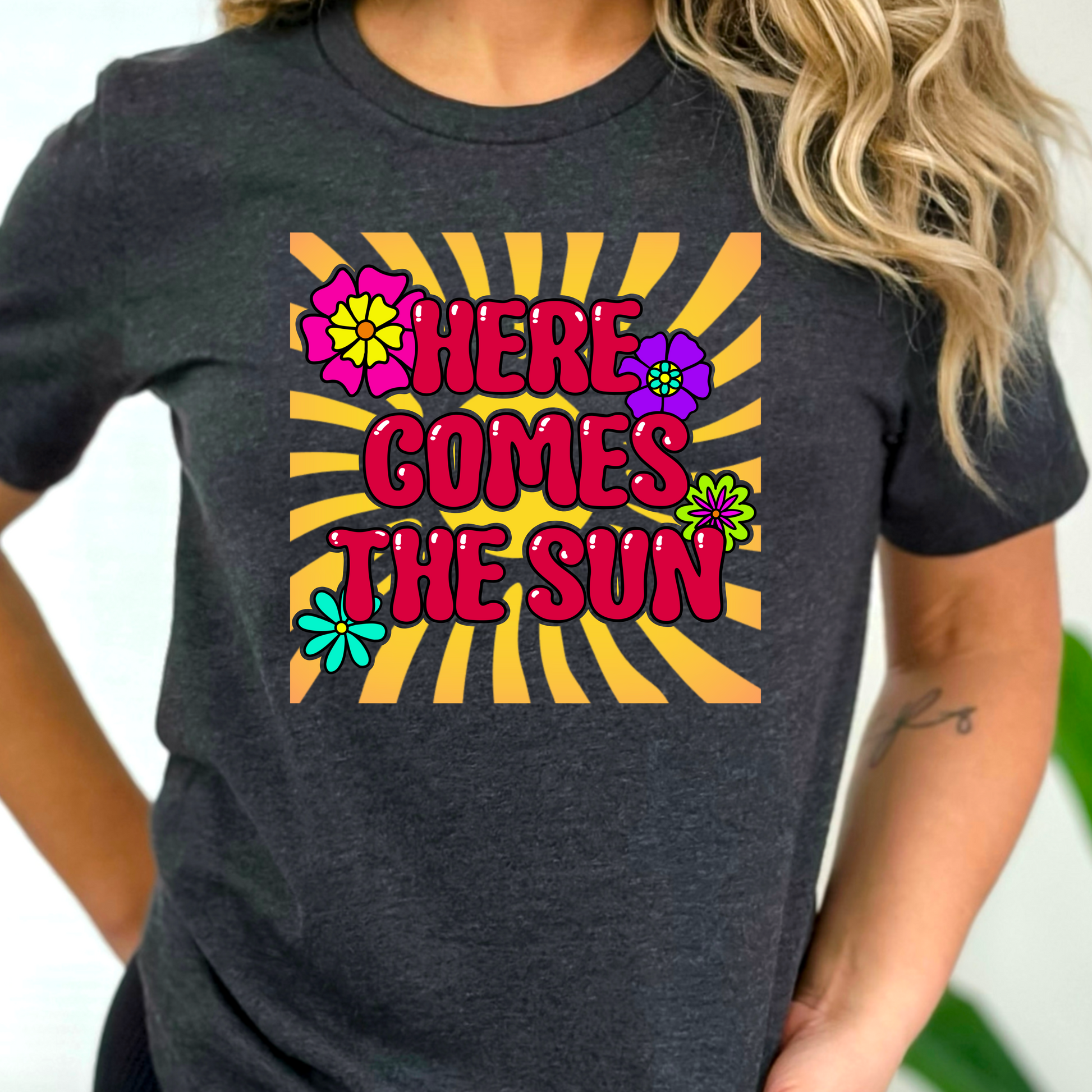 Brighten your day with this cheerful Here Comes The Sun t-shirt! Featuring a retro-inspired design with bold lettering, sun rays, and colorful flowers, this shirt brings all the sunny vibes. Perfect for warm weather, summer festivals, beach days, or spreading positive energy year-round.