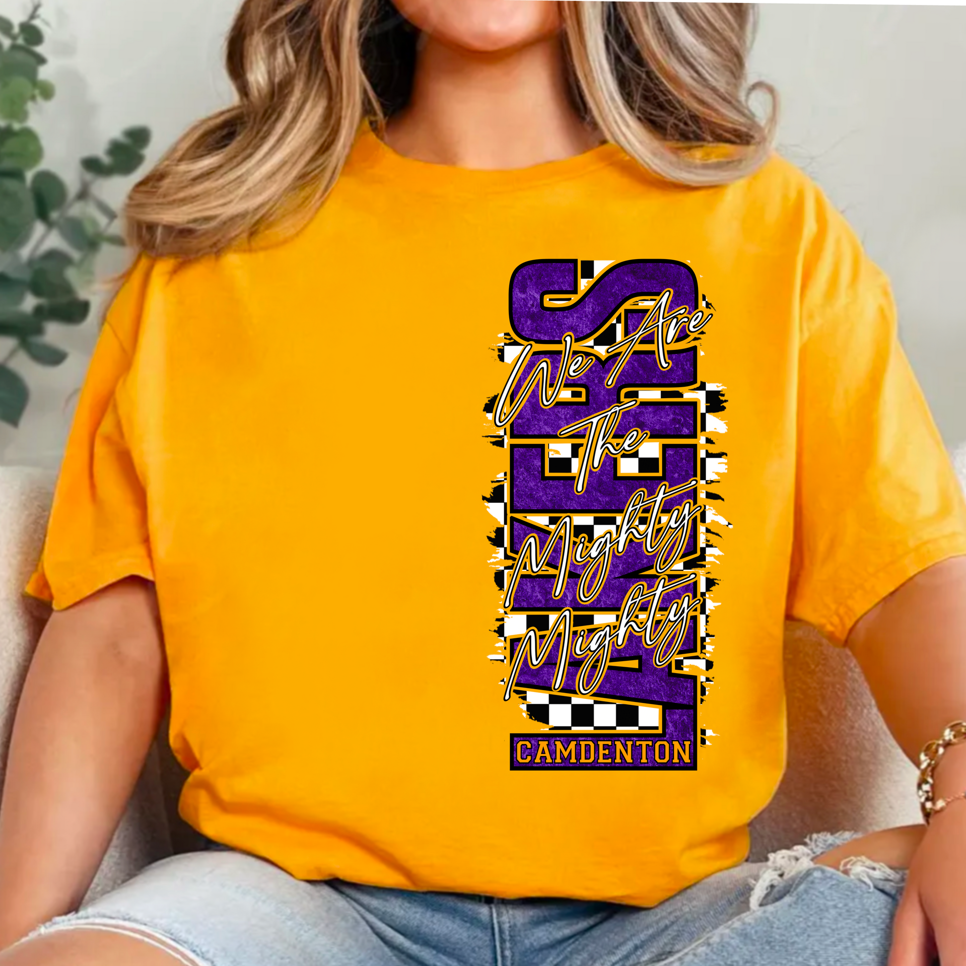 Rep the Lakers in bold style with this Camdenton spirit tee! Featuring stacked purple “LAKERS” lettering with checkerboard accents and a striking “We Are the Mighty Mighty” script design, this bright gold shirt is full of school pride. Perfect for game days, spirit events, or everyday support—this tee is made for true fans!