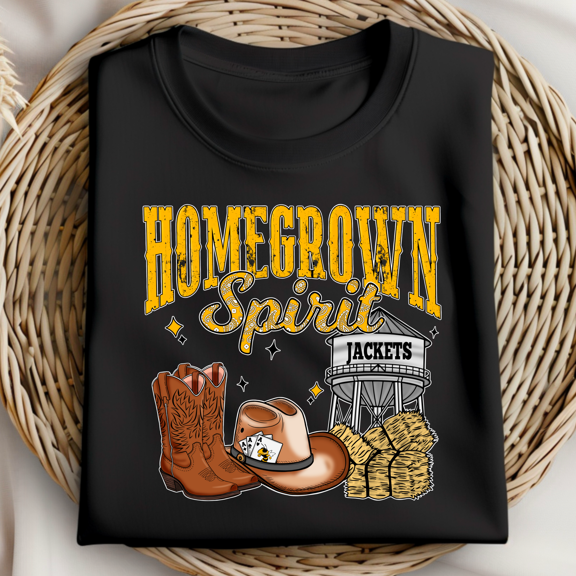 Rep your hometown pride with the “Homegrown Spirit” Jackets tee! With western flair like cowboy boots, a hat, and hay bales, this country-style design brings the heart of small-town football to life. A perfect pick for game days, tailgates, and fans who bleed yellow and black.