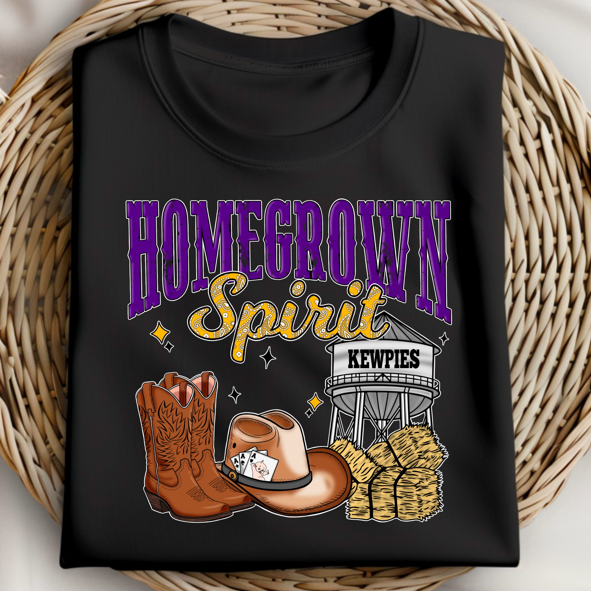 Show your love for small-town traditions and hometown pride in this “Homegrown Spirit” Kewpies tee! With bold purple and gold accents, classic cowboy details, and a rustic water tower design, it’s the perfect shirt for spirited fans who bring country charm to every game day.