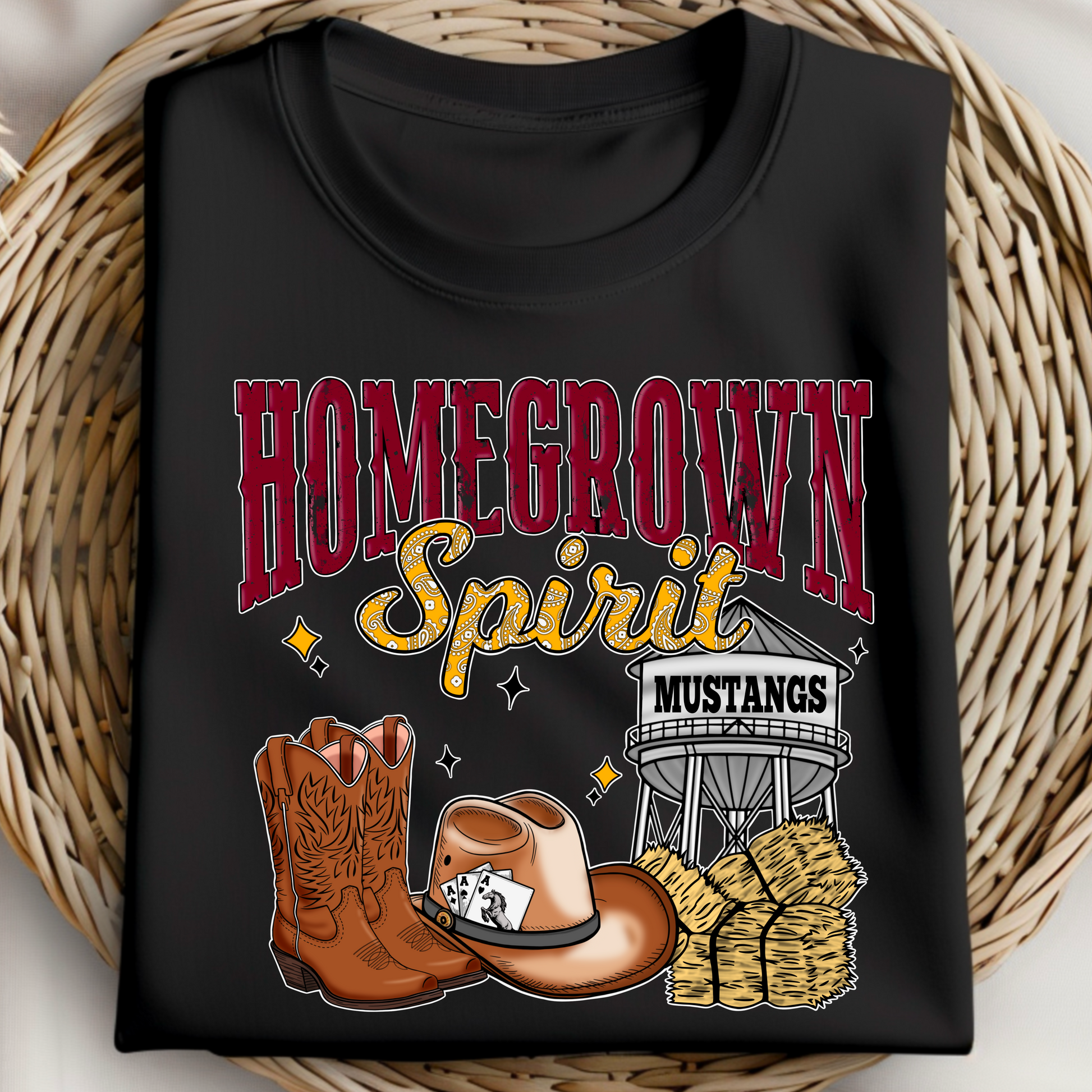 Saddle up with hometown pride in this “Homegrown Spirit” Mustangs tee! Designed with a rustic country flair—cowboy boots, a hat, hay bales, and your team name—it’s perfect for cheering on the Mustangs under the Friday night lights. A bold choice for game days and spirited fans alike!