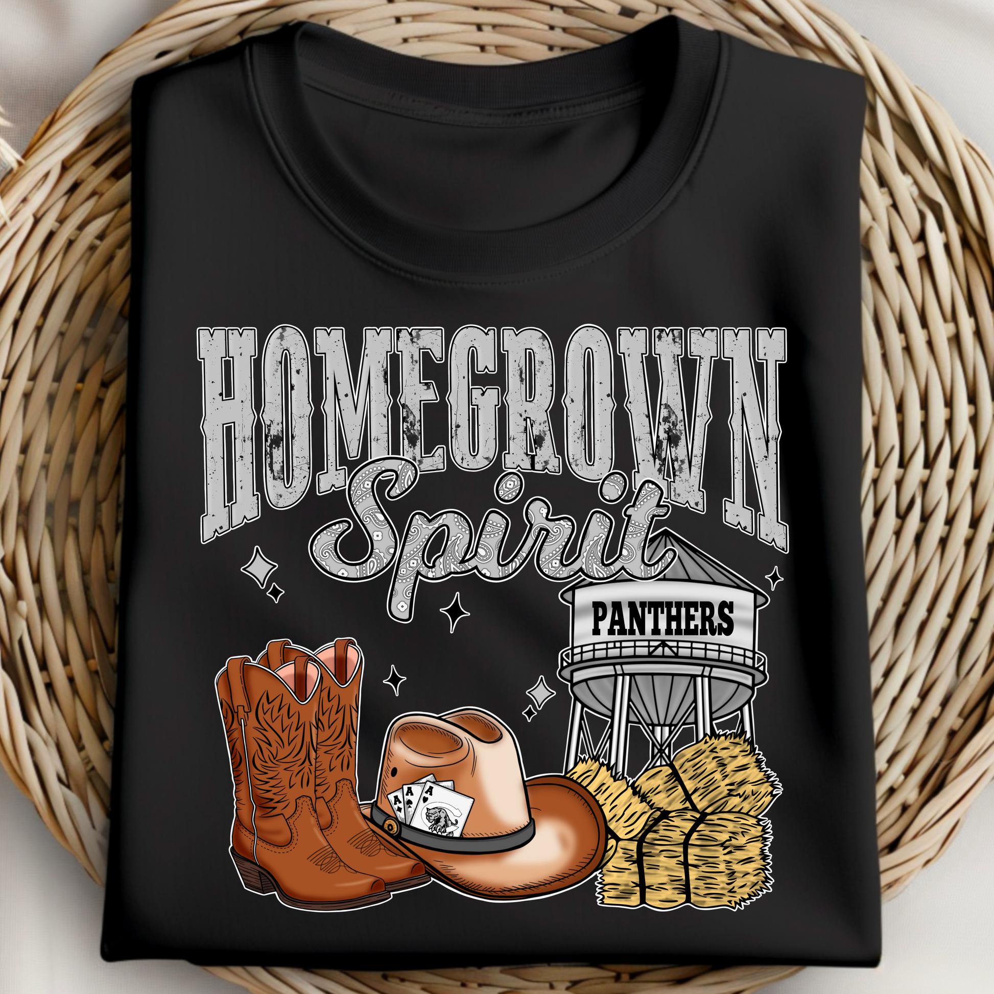 Classic country style meets fierce hometown pride in this “Homegrown Spirit” Panthers tee! Featuring a bold black and white design with western details like boots, a cowboy hat, and a water tower, it’s perfect for Friday night lights and all the Panther fans who stay true to their roots.