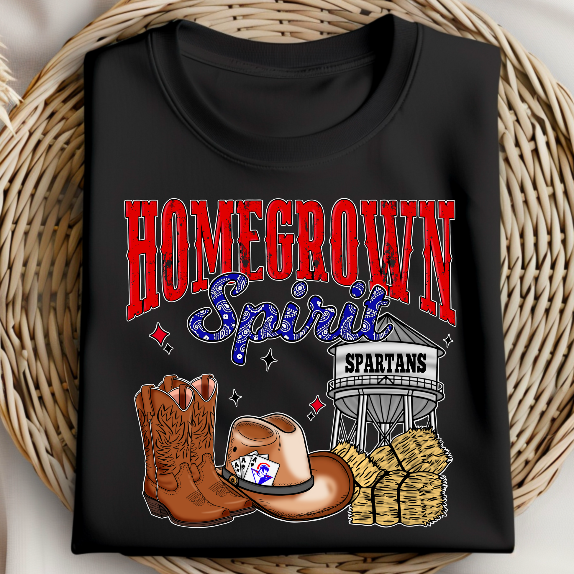 Stand tall for your team in this “Homegrown Spirit” Spartans tee! With rustic cowboy flair and bold red and blue accents, this shirt brings together small-town roots and team pride. A perfect match for game days, parades, and fans who live for that hometown hustle.