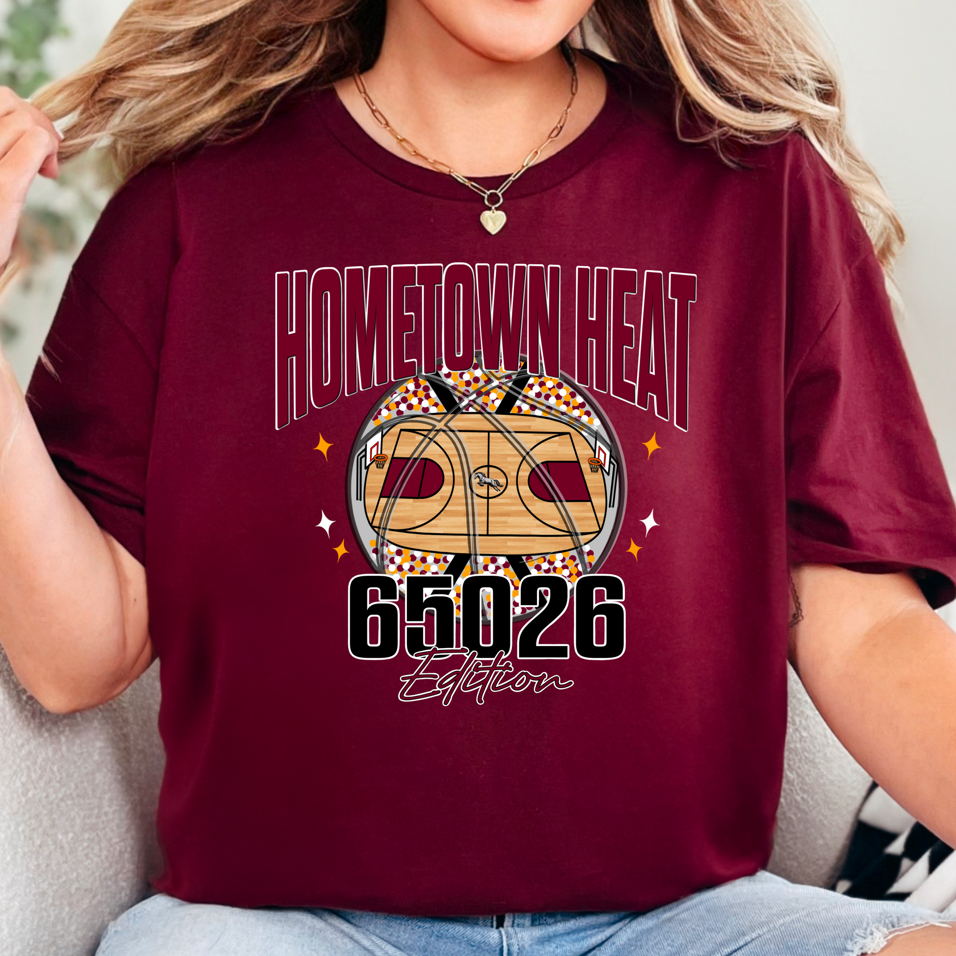 Rep your roots with this bold “Hometown Heat” 65026 Edition tee! Featuring deep maroon tones, a stylish full-court design, and checkered accents, this shirt is perfect for Mustangs fans who bring passion, pride, and hometown heat to every game.