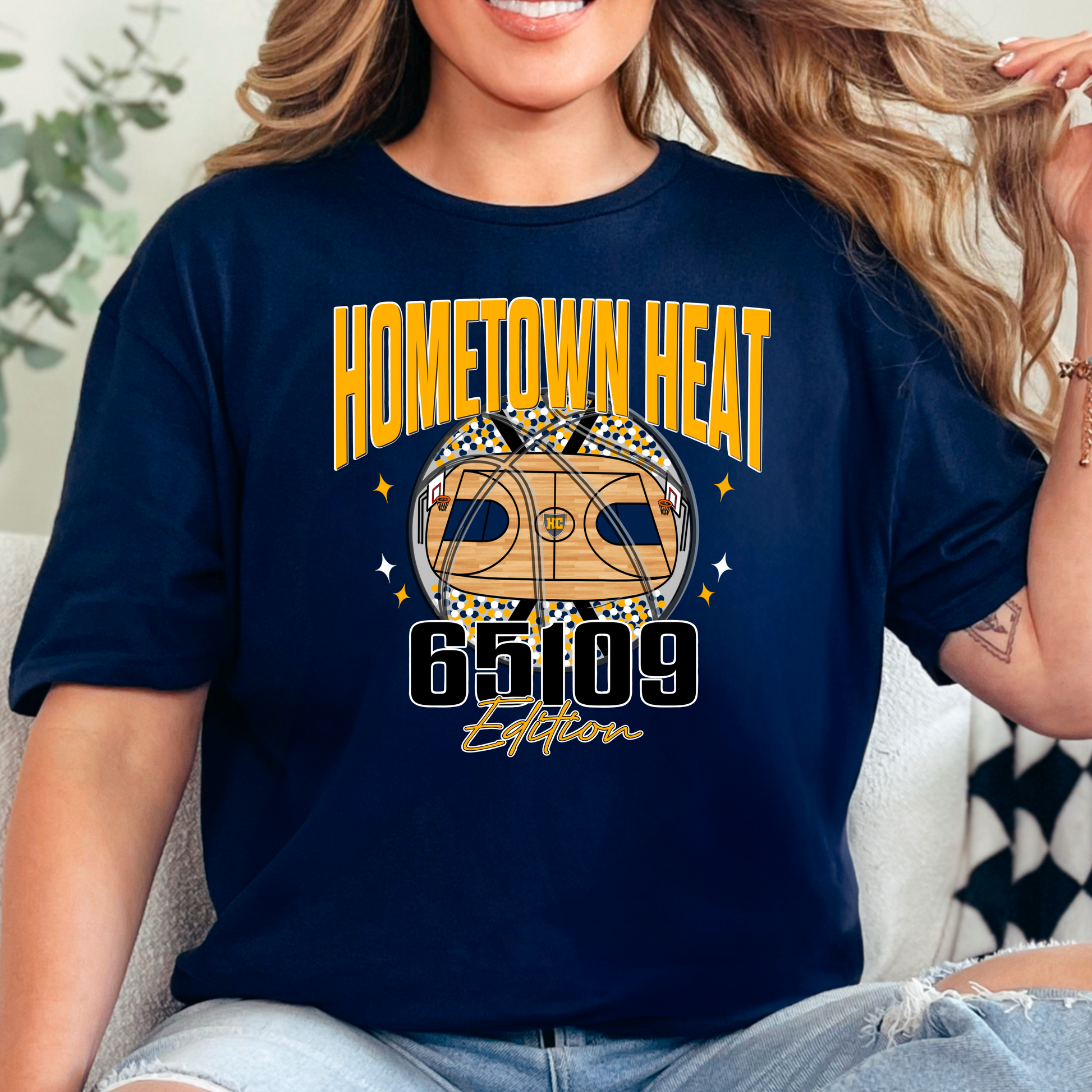 Bring the fire with this bold “Hometown Heat” 65109 Edition tee! Featuring a full court graphic, checkered accents, and varsity-style text, this shirt reps local basketball pride with serious style. Perfect for cheering courtside or repping your zip code all season long.