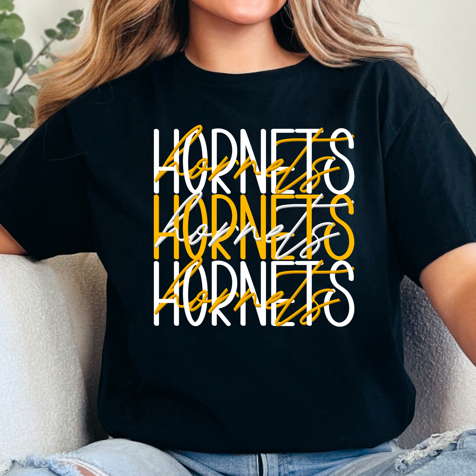 Show your Hornets spirit in style with this bold stacked text tee! Featuring layered block lettering and script overlay in yellow and white, this design is perfect for game days, pep rallies, tournaments, or casual everyday wear. A clean, modern way to support your team colors!