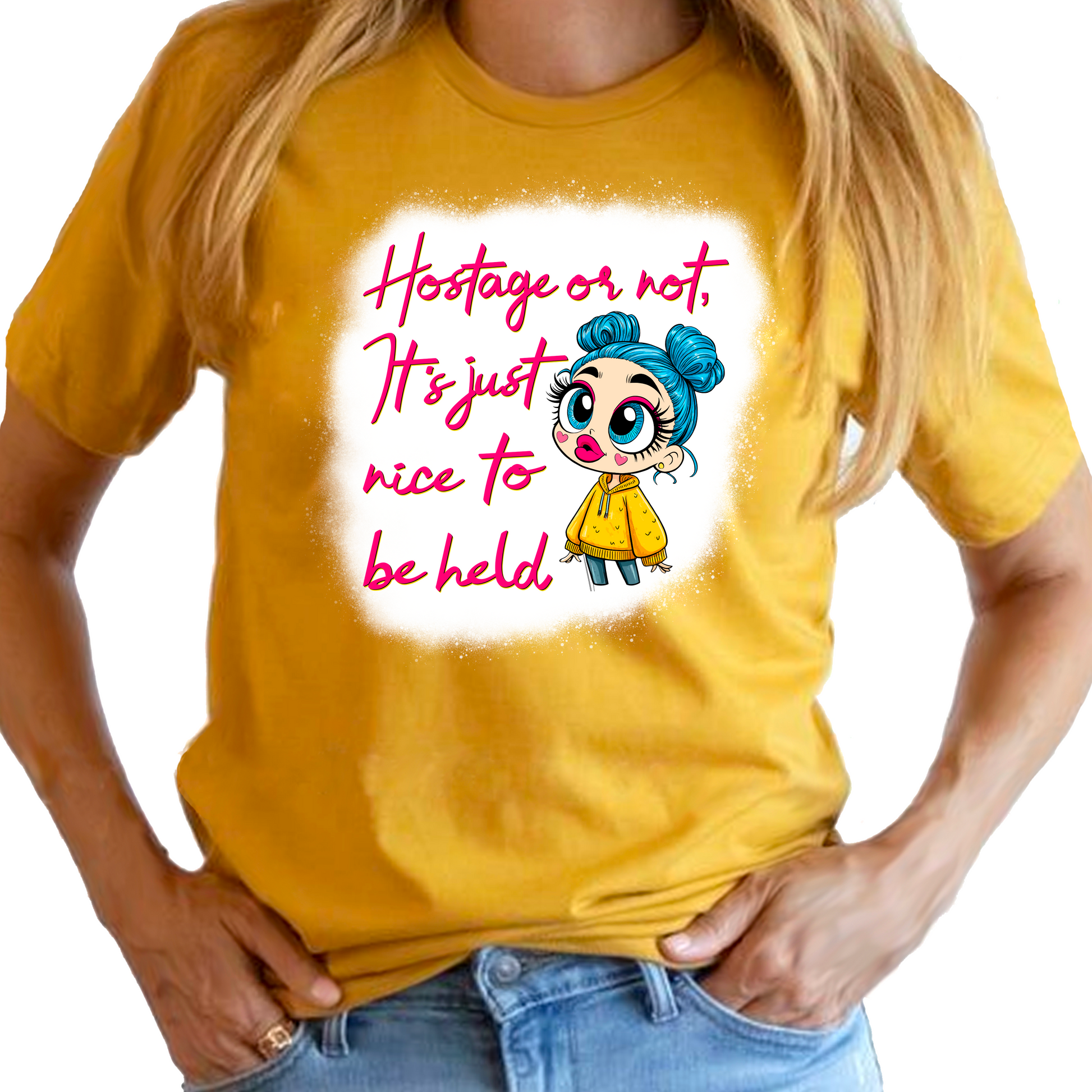 Add a little humor and sass to your wardrobe with this playful Hostage or Not, It’s Just Nice to Be Held t-shirt! Featuring a fun cartoon girl illustration with bright colors and a lighthearted saying, this tee is perfect for anyone who loves a bit of sarcasm mixed with cuteness.