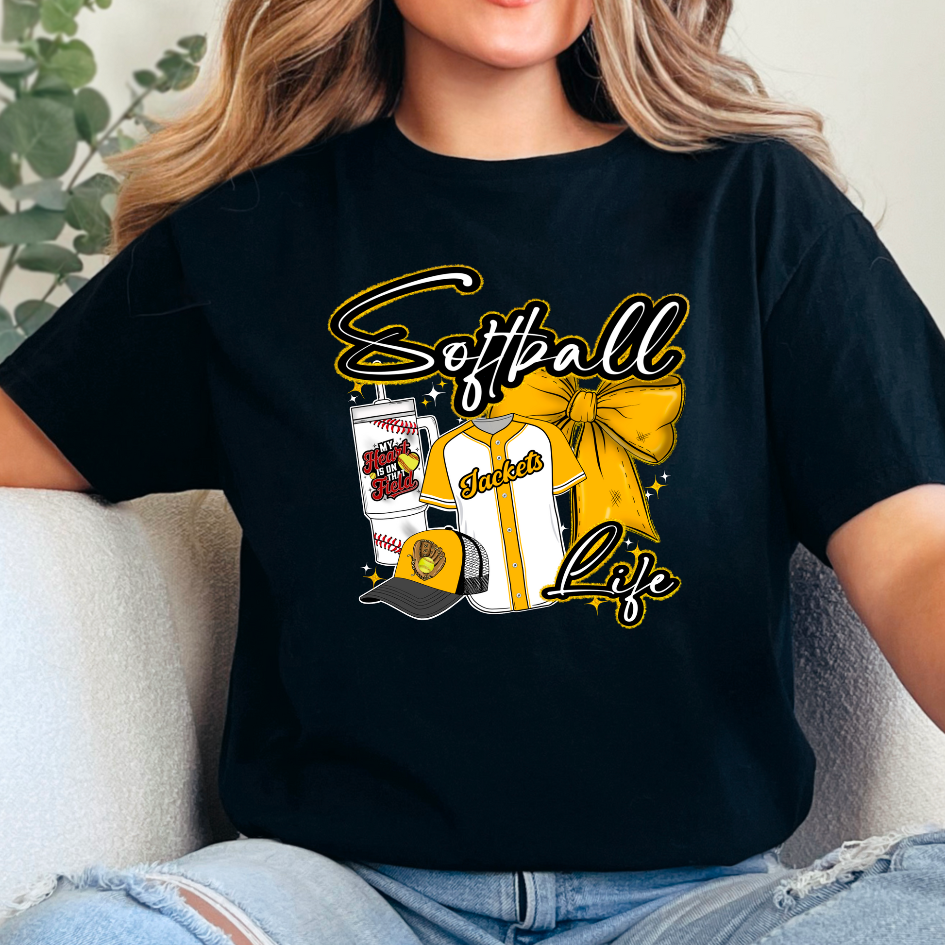 Cheer loud and proud in this Softball Life t-shirt! Featuring bold yellow and black colors with a detailed design including jersey, bow, cap, tumbler, and glove, this tee is perfect for tournaments, practices, or simply repping your team spirit every day.