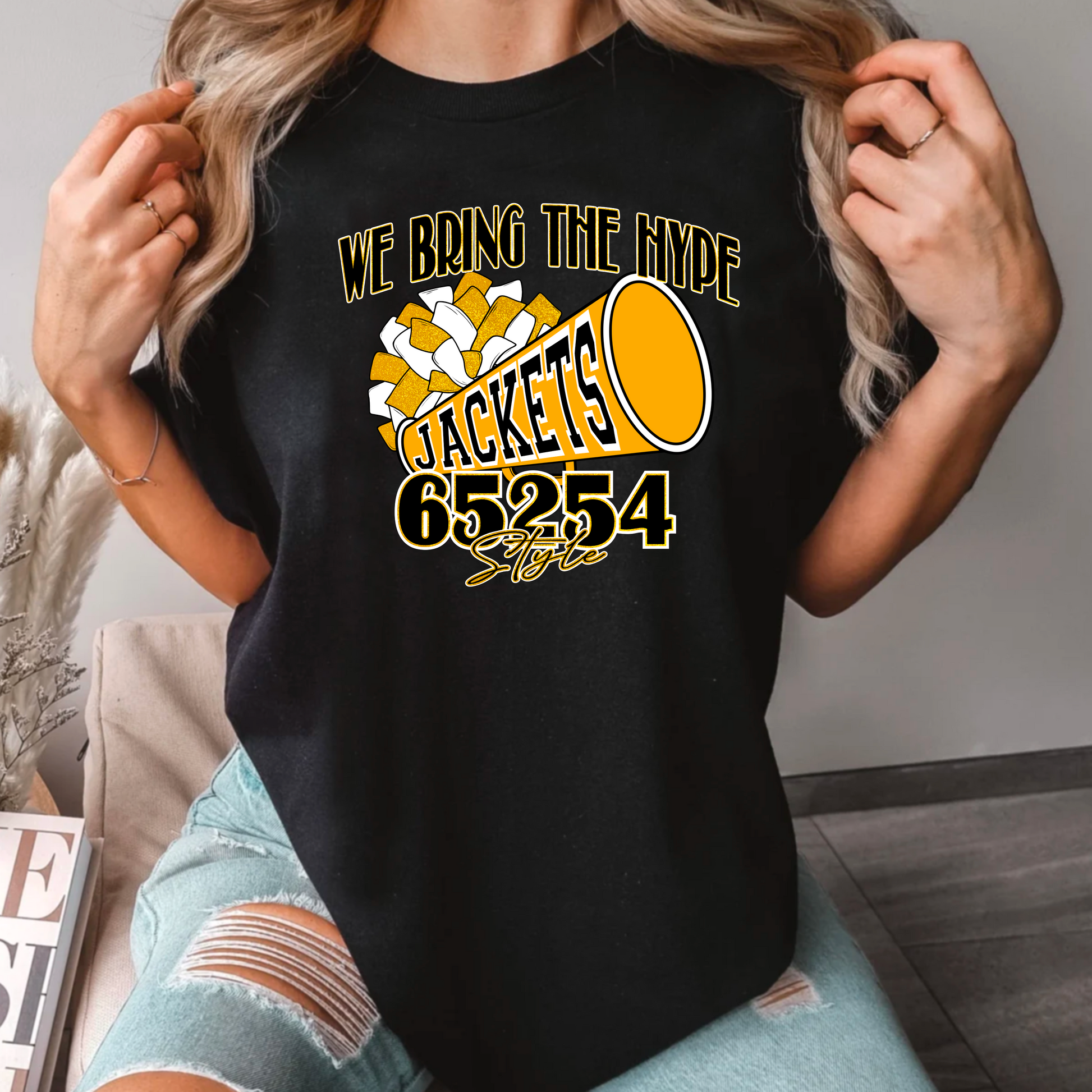 This 65254 Jackets tee is full of cheer pride—decked out with bold black and gold, a cheer megaphone, and standout bows. Perfect for loud fans, louder spirit, and even louder outfits!