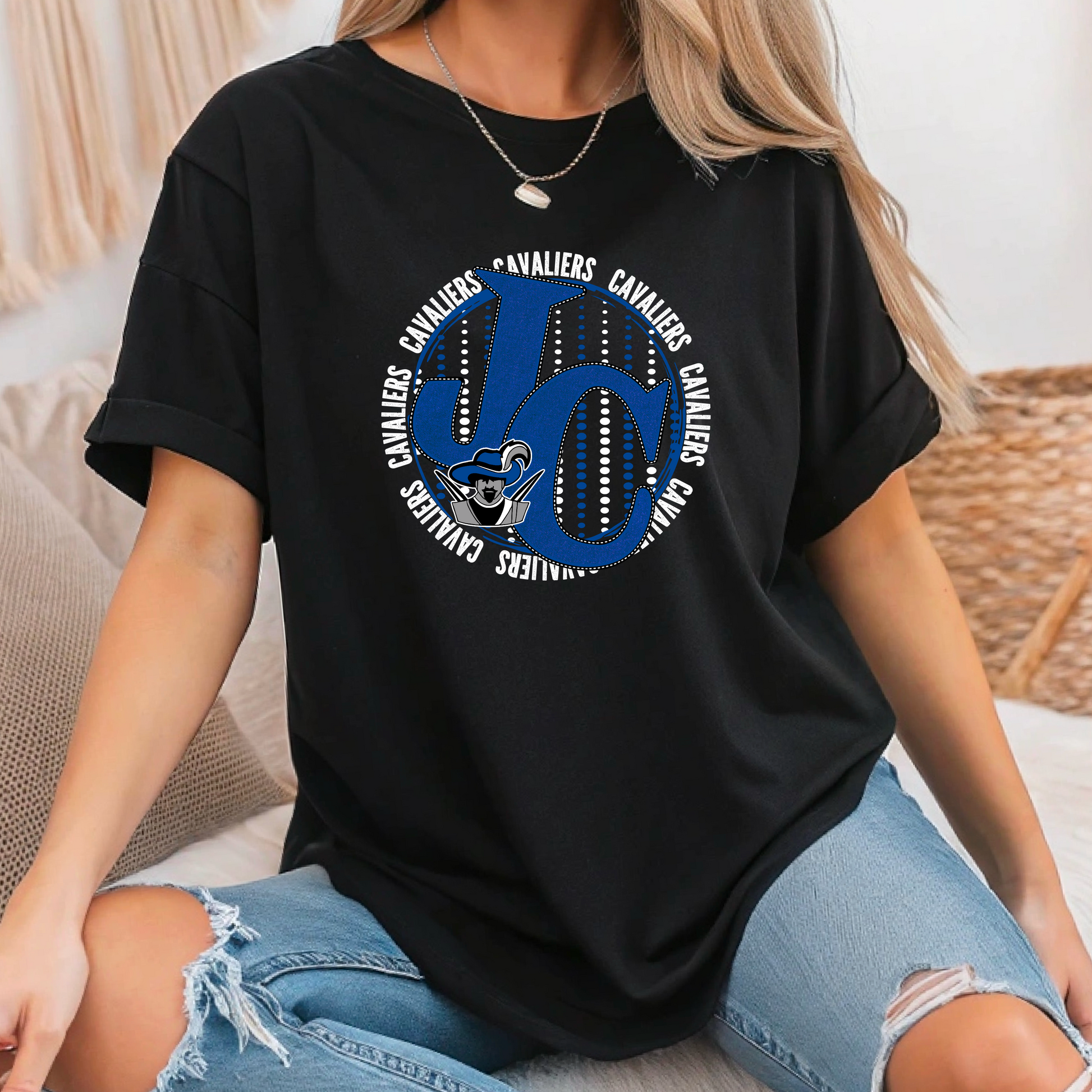Rep your team in bold style with this JC Cavaliers patch tee! Featuring a large JC monogram, a fierce Cavalier mascot, and a repeating text circle design, this shirt is perfect for game days or everyday school pride. Clean, crisp, and full of spirit!