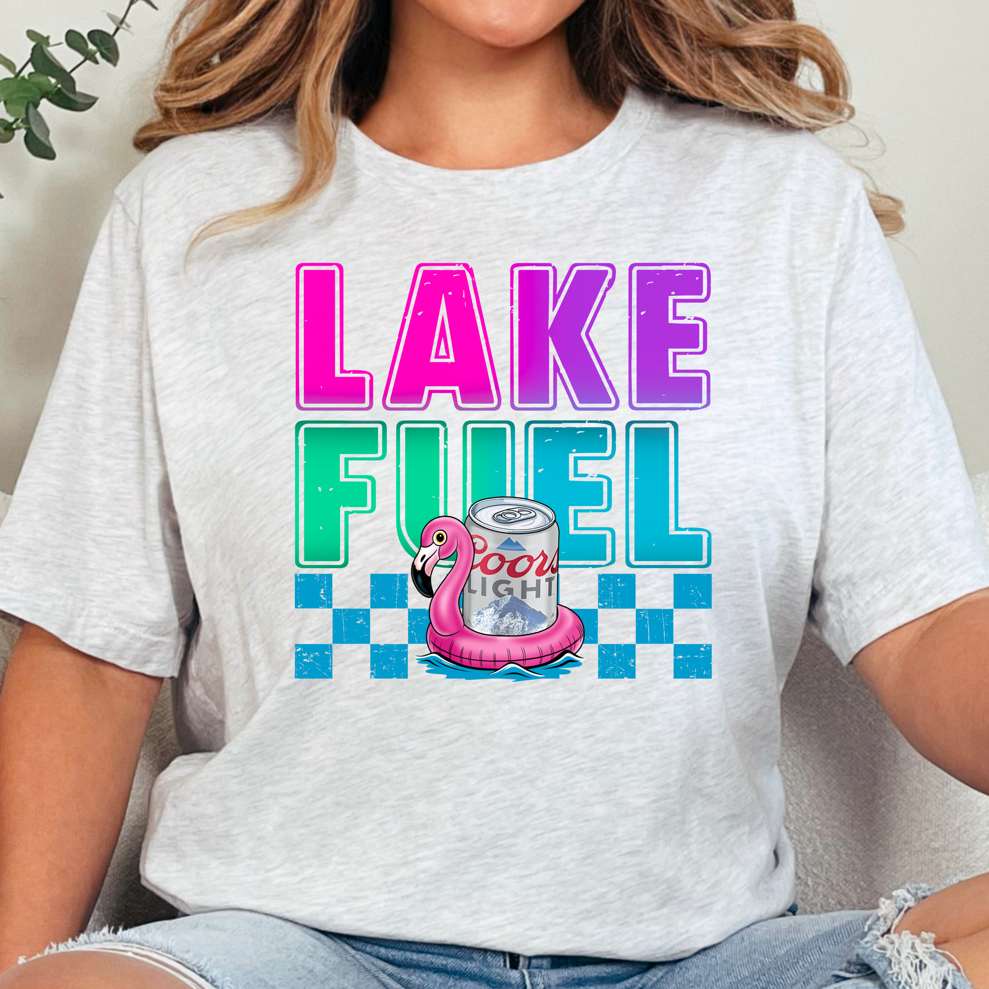 Fuel up for lake life with this colorful retro “Lake Fuel” tee, featuring bold lettering, checkerboard flair, and a flamingo float keeping things chill. A fun summer shirt for sunny days, coolers, and carefree weekends at the lake. It's all about vibrant energy and easy vibes!