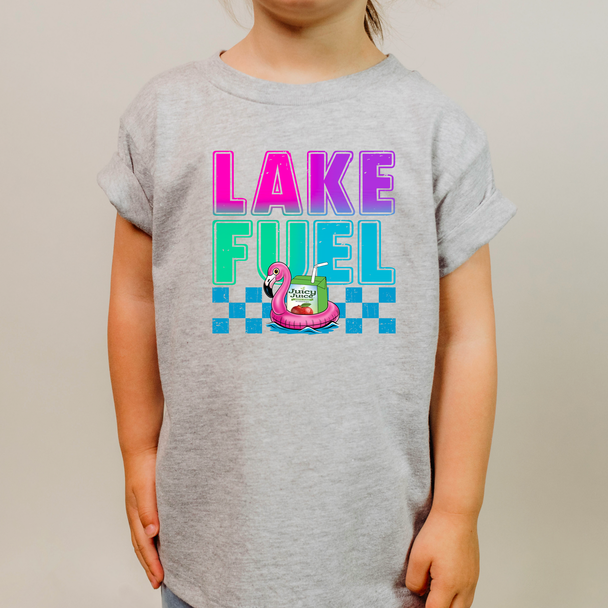 Keep it cool and colorful with this adorable “Lake Fuel” kids tee! Featuring a vibrant gradient design, pink flamingo float, and a Juicy Juice box, this shirt is perfect for lake days, beach play, or just soaking up the sunshine. Ideal for toddlers and kids who are always on the move!