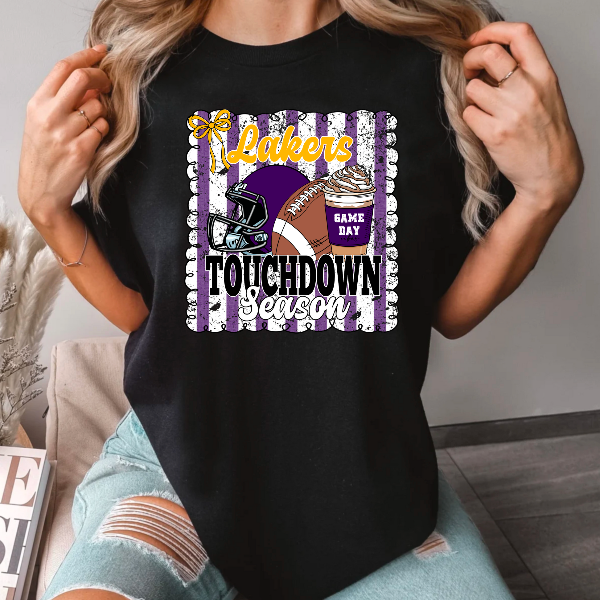 Get ready to cheer in cozy style with this Lakers “Touchdown Season” t-shirt! Featuring a fun purple and white striped background with a football, helmet, whipped coffee, and playful Game Day cup, this tee is perfect for fans who love spirited Saturdays and cozy vibes. Great for tailgates, school games, and fall football fun. Touchdown, Lakers!