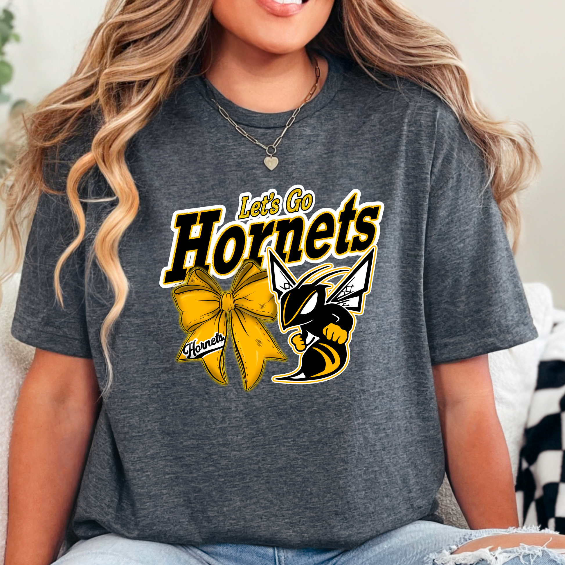 Show up and shout loud with this “Let’s Go Hornets” t-shirt! Featuring bold varsity lettering, a fierce hornet mascot, and a bright cheer bow for added flair, this tee is perfect for fans, cheerleaders, and school supporters. Whether it's game day or spirit week, this heather charcoal shirt delivers style and school pride in one fun package. Go Hornets!