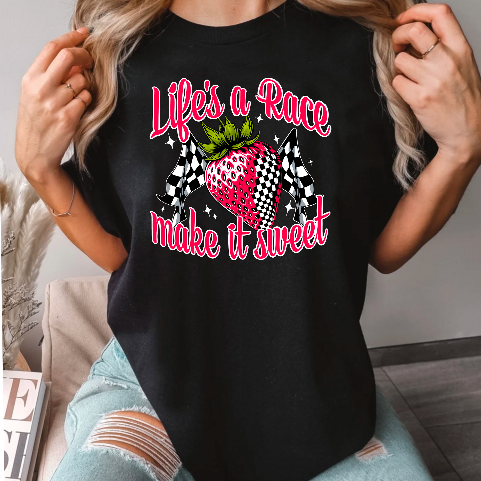 Fuel your day with good vibes and a touch of sugar! Our Life’s a Race, Make It Sweet tee is the perfect combo of bold attitude and playful charm, featuring a race-ready strawberry and checkered flags that say you’re here to win—and look cute doing it.