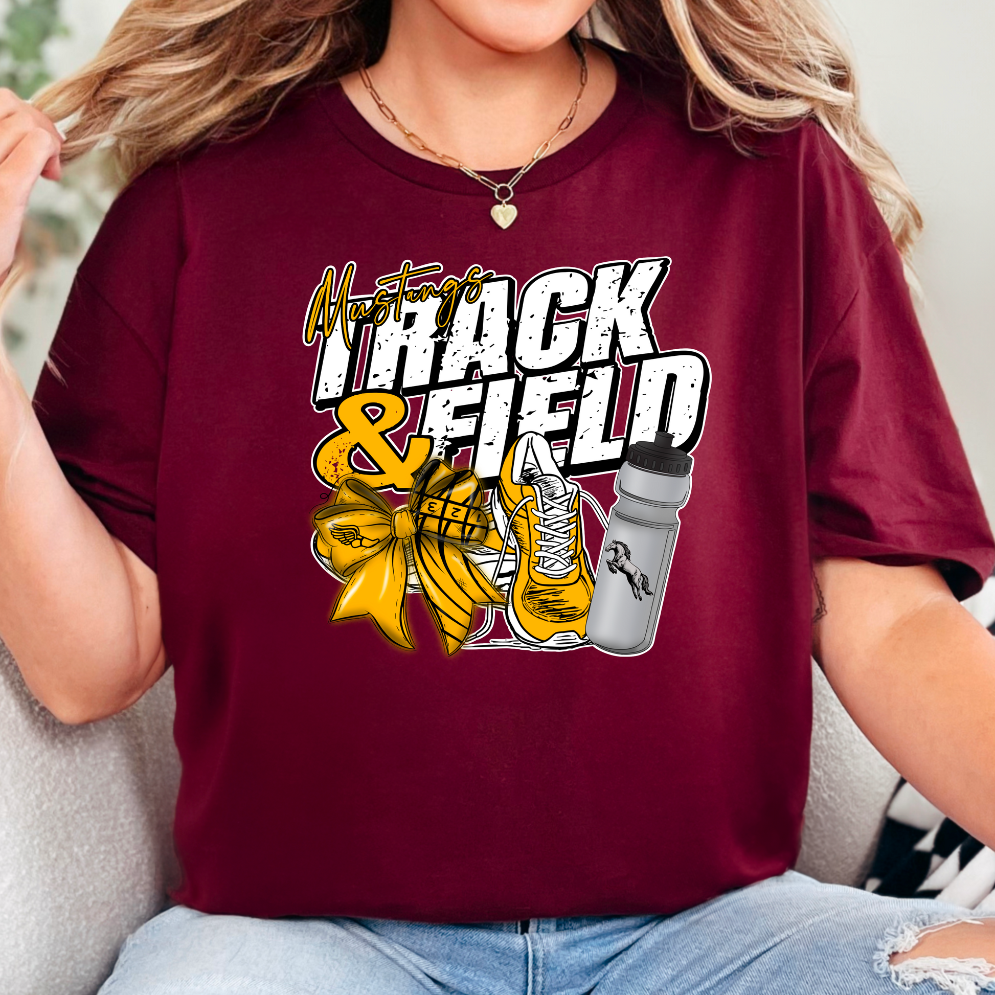 Cheer for the Mustangs in this bold Track & Field tee! Featuring a gold track shoe, stopwatch ribbon, and water bottle with a Mustang detail, this design brings energy and pride to every event. The large white block lettering stands out on a maroon shirt, making it perfect for athletes, fans, and supportive families. Go Mustangs!