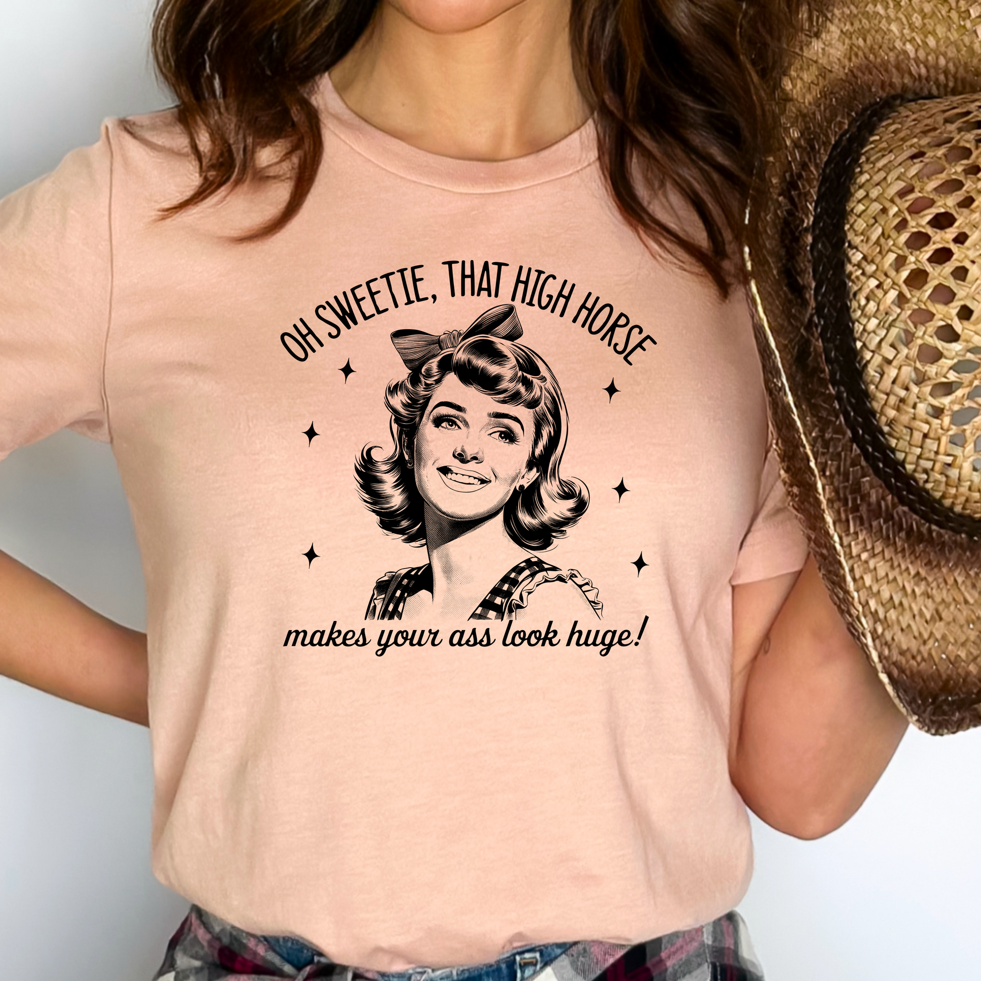 Bring a little sass and humor to your wardrobe with this Oh Sweetie, That High Horse Makes Your Ass Look Huge! graphic tee! Featuring a vintage-inspired smiling cowgirl design with playful western flair, this shirt is perfect for rodeo weekends, country concerts, or just making a bold statement. A must-have for cowgirls who love their humor with a touch of retro.