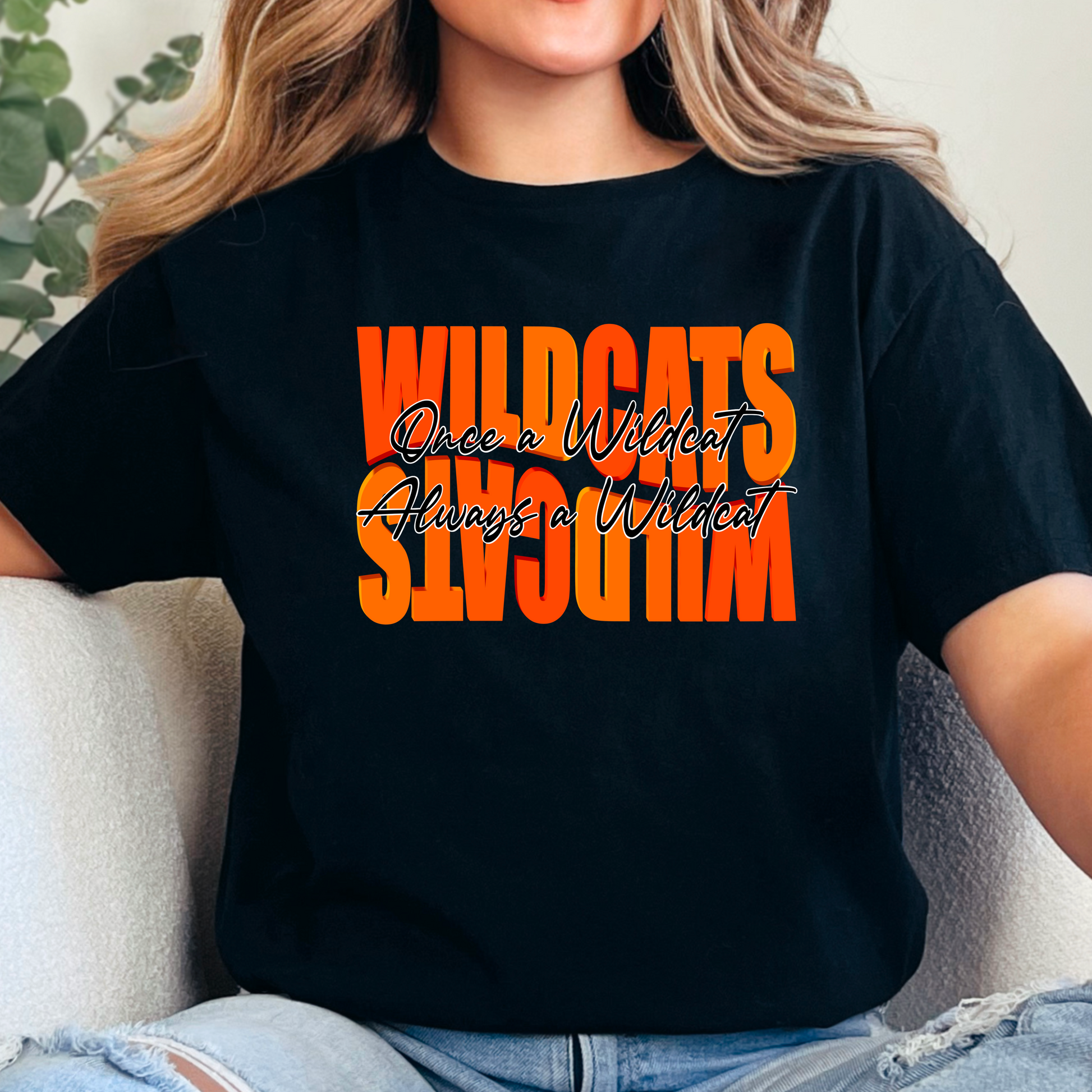 Show your fierce loyalty with this bold “Once a Wildcat, Always a Wildcat” tee. Featuring mirrored orange block text and stylish script overlay, it’s perfect for students, alumni, or die-hard fans repping their wild side.