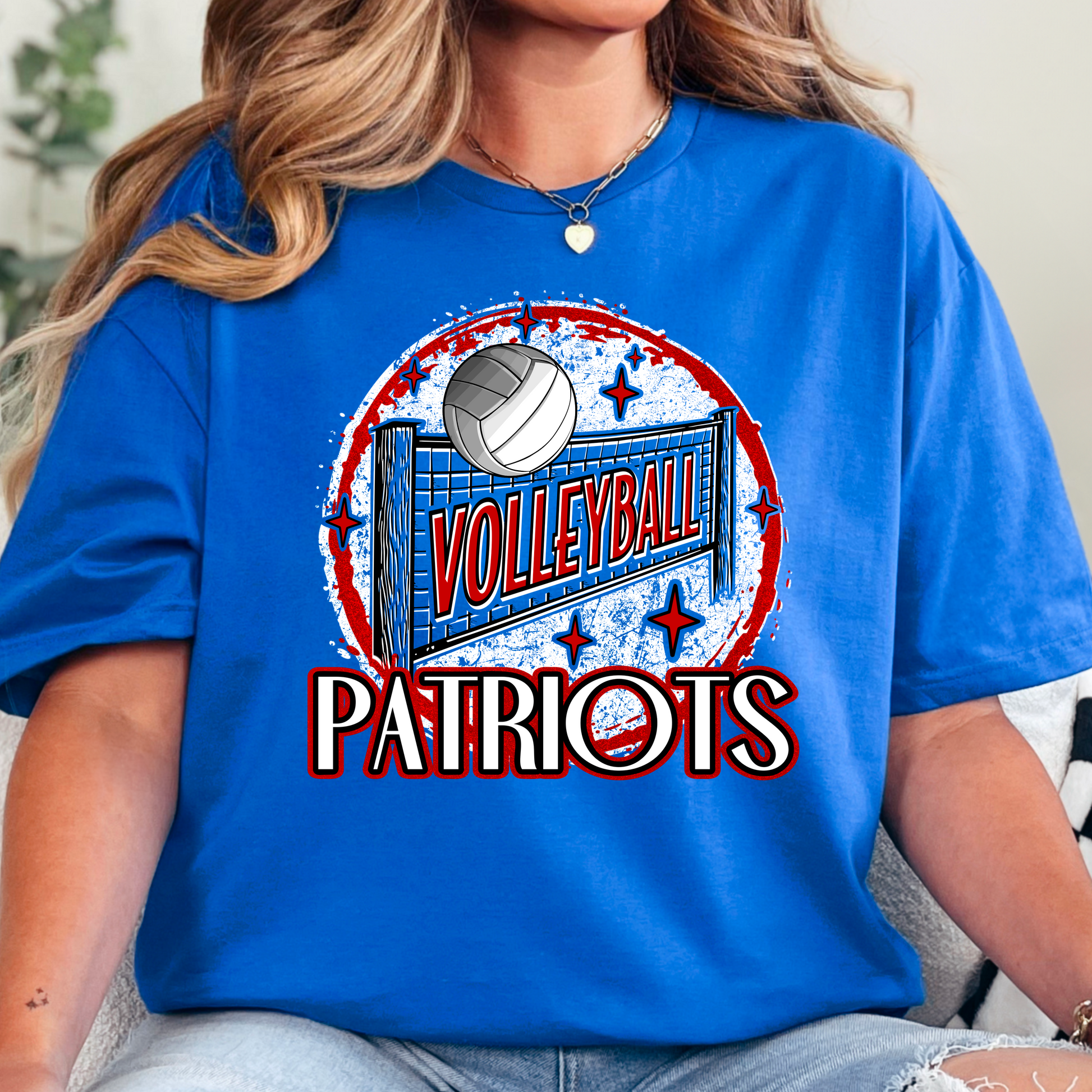 Cheer on your volleyball team in this bold blue “Patriots Volleyball” tee! Featuring a distressed circle backdrop, net and ball graphic, and striking red and white lettering, it's the perfect shirt for game days and school spirit.