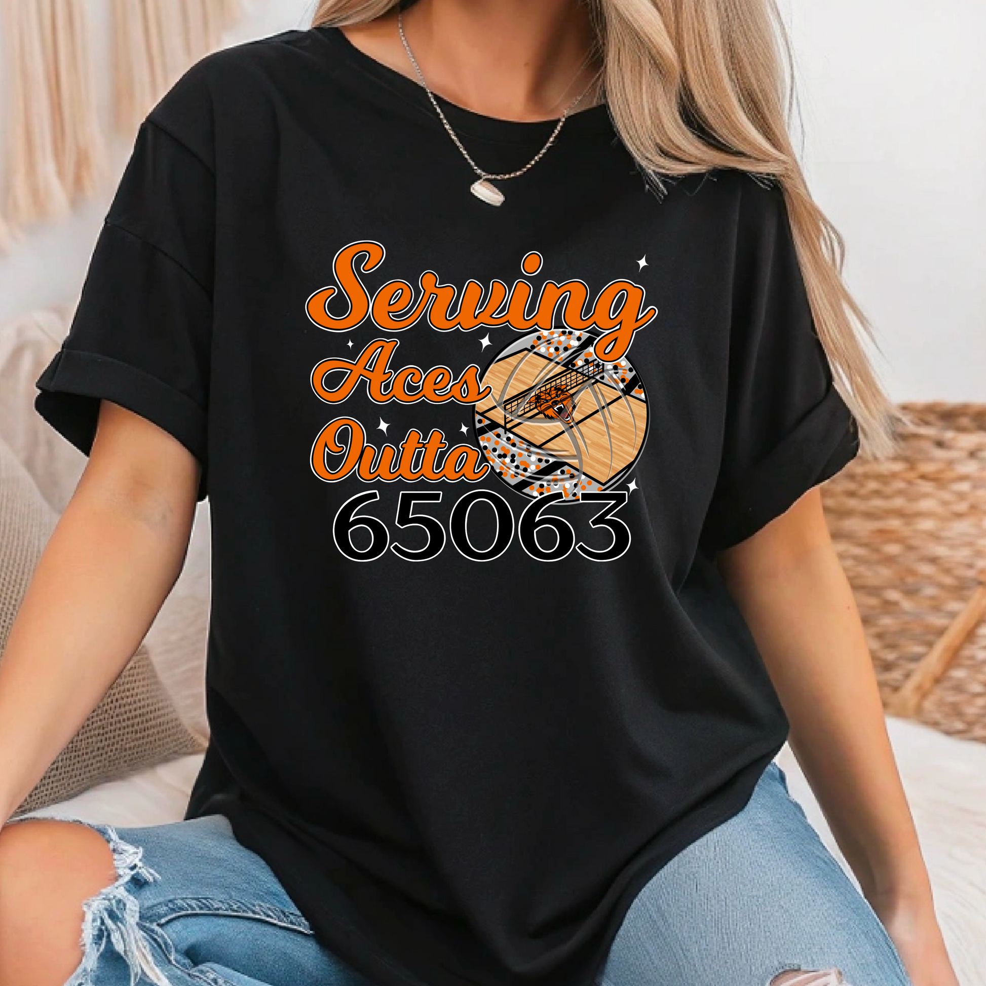 Rep your hometown and love for the game with the “Serving Aces Outta 65063” Wildcats volleyball tee! Featuring orange and black team colors with a dynamic court graphic, this tee is perfect for proud fans, athletes, and parents. Great for game day or everyday wear!
