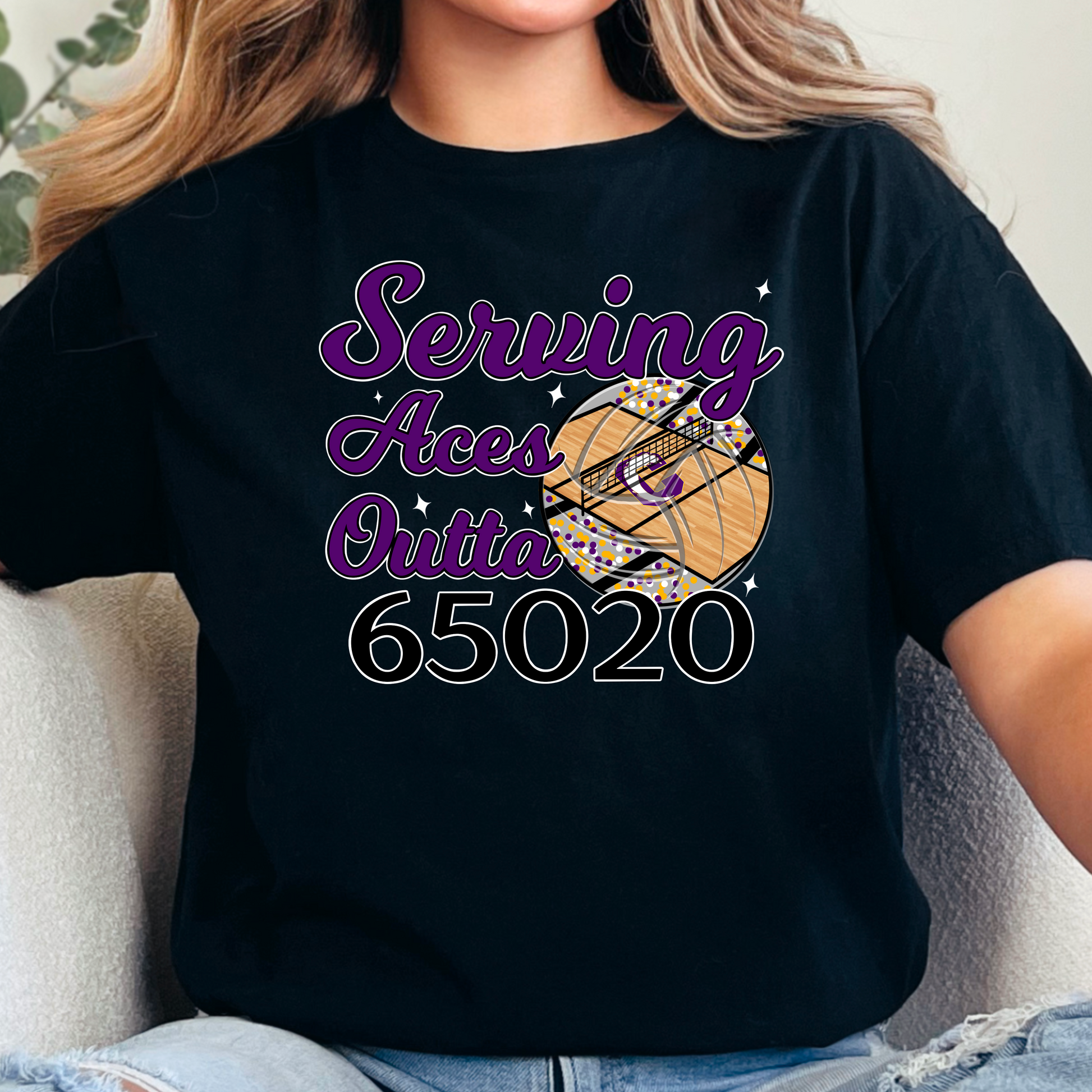 Show your pride in the 65020 with this “Serving Aces Outta” Lakers volleyball tee! Featuring eye-catching purple and gold colors with a volleyball net graphic, this shirt is perfect for athletes, fans, and local supporters. Great for game day, practice, or everyday school spirit wear.