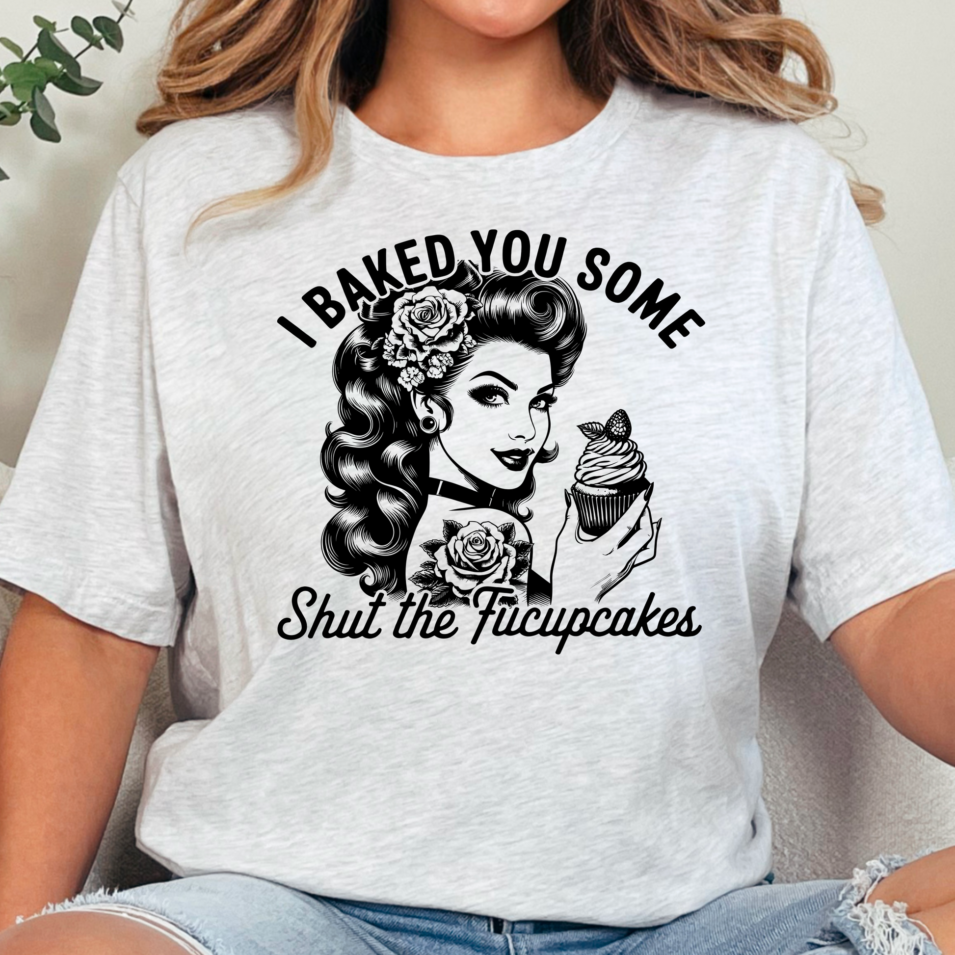 Bold, cheeky, and unapologetically sassy! This retro-inspired “I Baked You Some Shut the Fucupcakes” tee features a vintage pin-up holding a cupcake with fierce flair. Perfect for those who serve sweetness with a side of sarcasm.