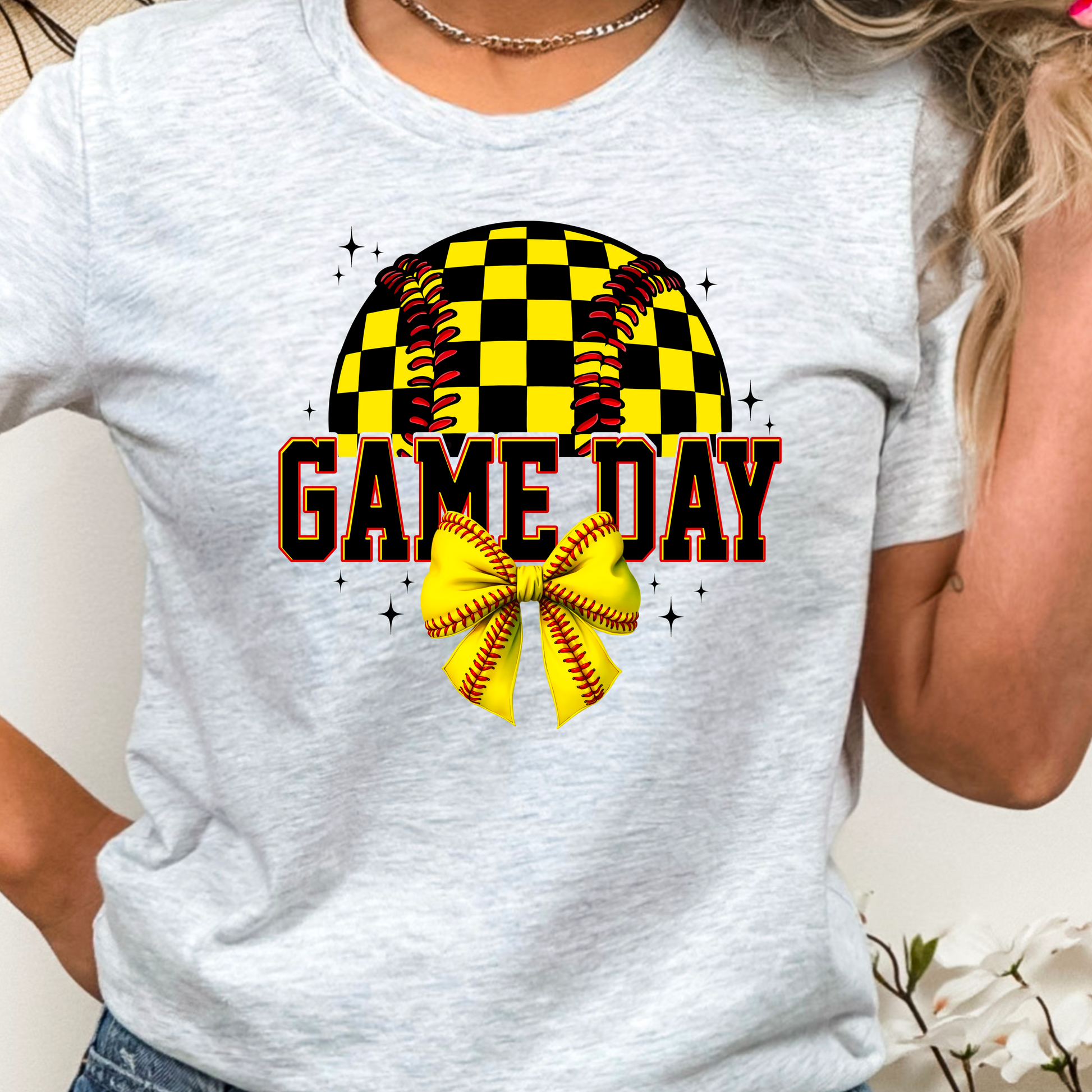 Bring bold vibes to the ballfield with this Softball Game Day tee! Featuring a striking black-and-yellow checkered softball, red stitching, and a matching yellow bow, this fun and sporty design is perfect for showing off your game day pride in standout style.