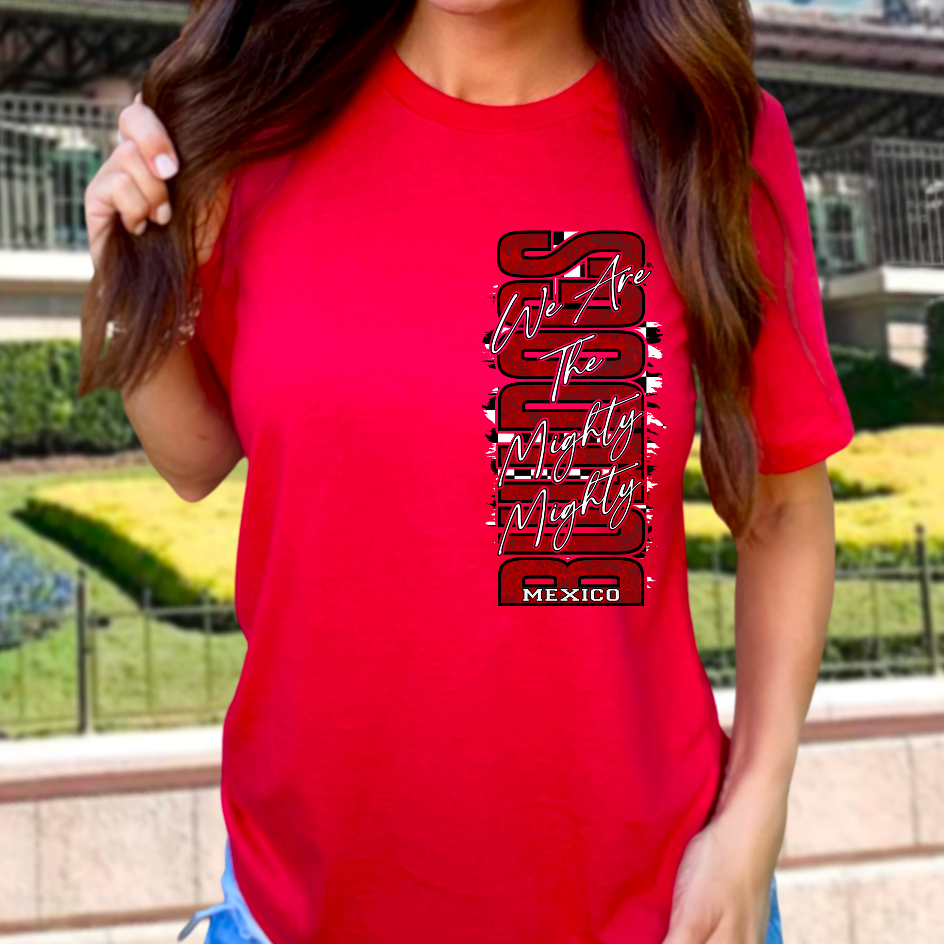 Bring the energy with this Mexico Bulldogs “We Are the Mighty Mighty” t-shirt! Bold red with stacked BULLDOGS lettering, edgy brush stroke accents, and the school name at the bottom make this tee a fan favorite. Perfect for game day, pep rallies, or any time you want to rep the Bulldogs with pride!