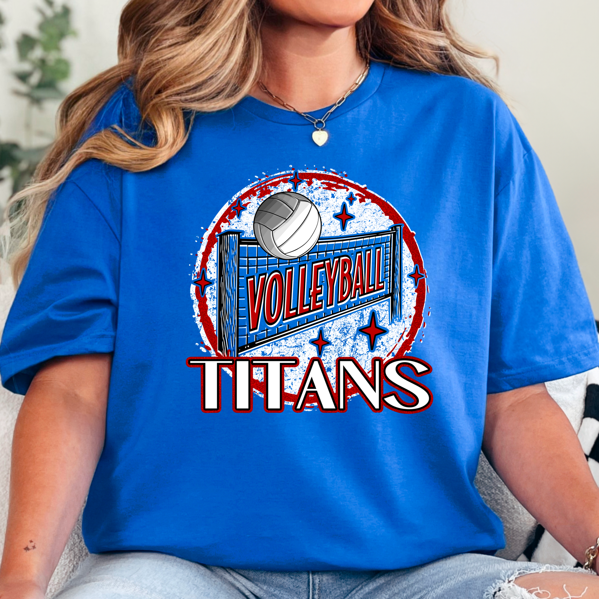 Serve up style and school pride in the Titans Volleyball Tee! This design features a volleyball and net with grunge texture and bold red accents—perfect for players, fans, and proud volleyball moms.