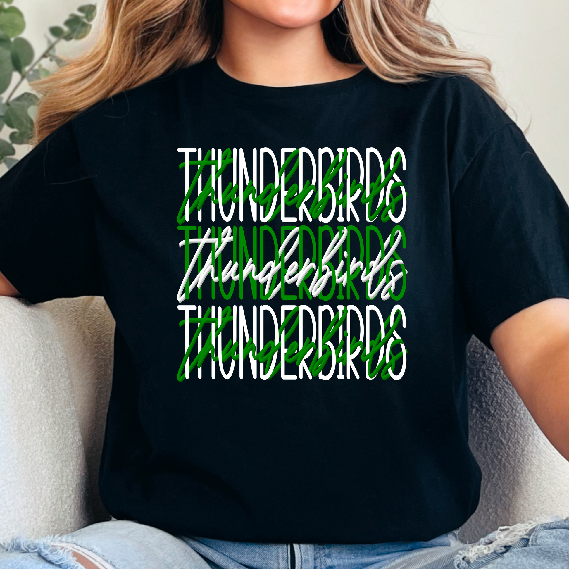 Show your school spirit in bold style with the Thunderbirds Stacked Script Tee! Featuring a triple-layered “Thunderbirds” design with bold block letters and a green-and-white script overlay, this shirt is both trendy and team-proud. It’s the perfect look for spirited fans who love a fun, modern twist on classic school apparel.