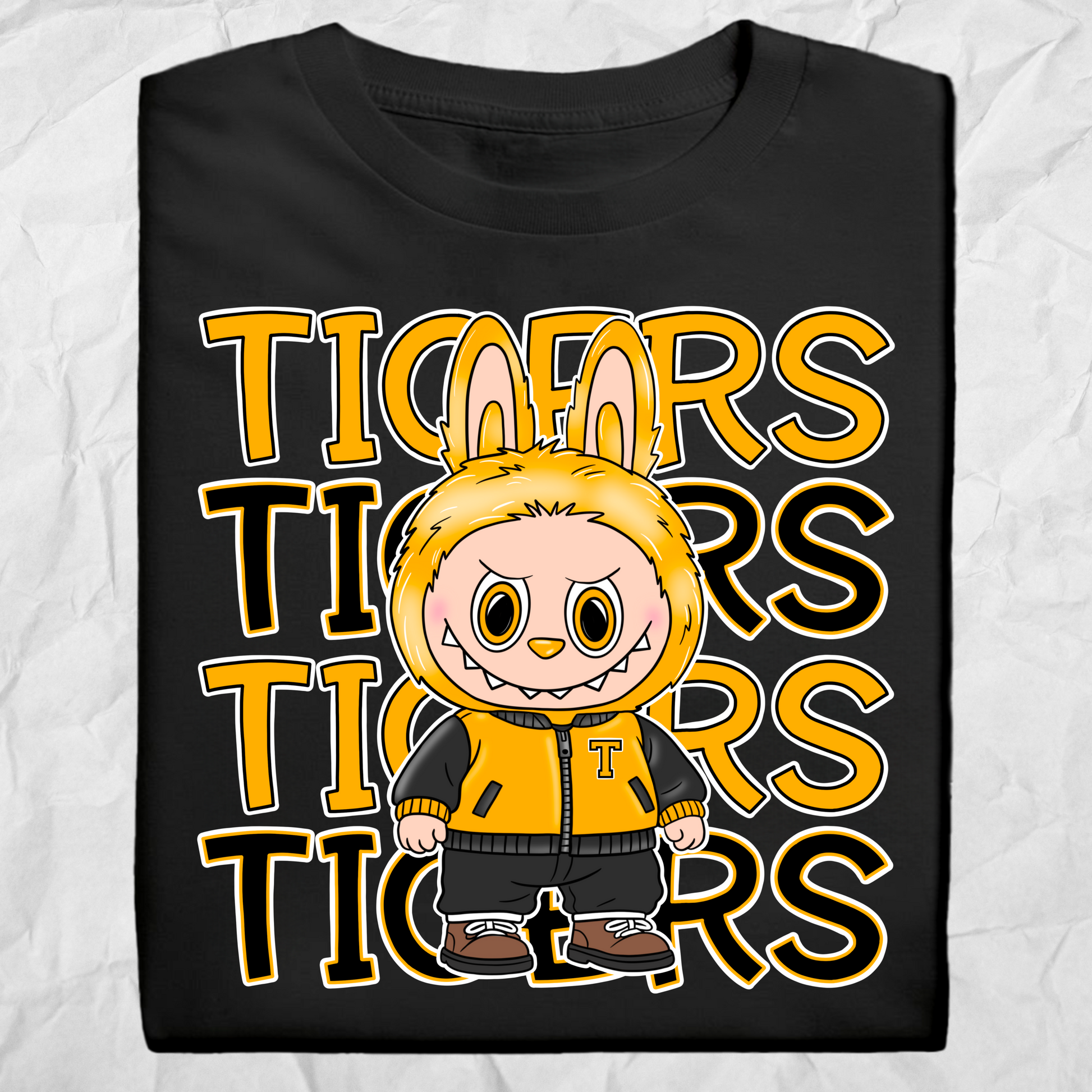 Roar with pride in the Tigers Monster tee! This bold design features a yellow monster in a varsity-style “T” jacket with stacked “TIGERS” text in yellow and black. Fun, fierce, and full of team energy—perfect for students, fans, and school spirit wear!