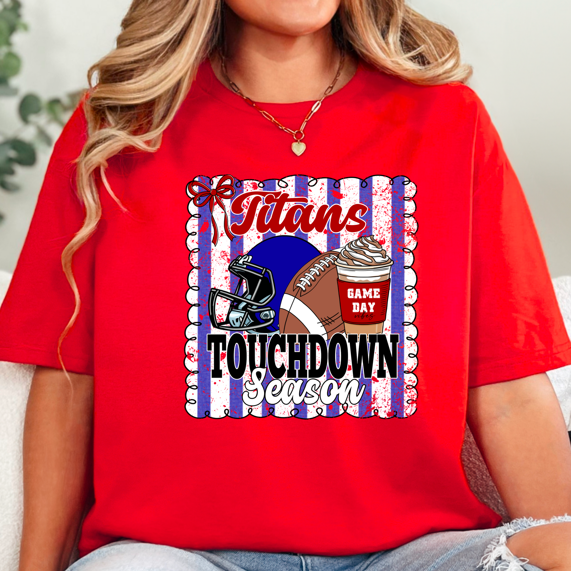Celebrate football season in fierce style with the Titans Touchdown Season Tee! Featuring a bold blue-striped frame with a helmet, football, and game day coffee, this design screams team pride. Perfect for fans who love cozy vibes and Friday night lights!