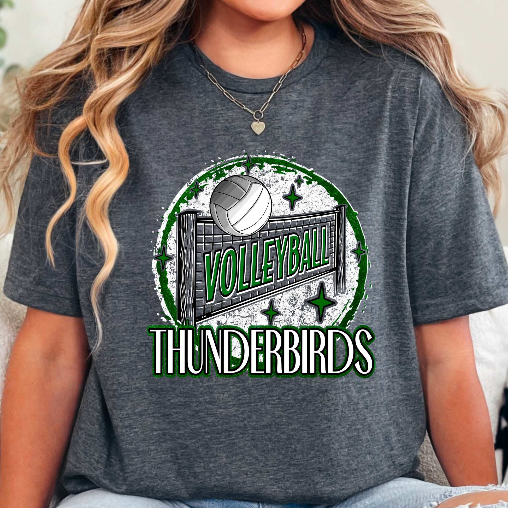 Serve up style and school pride in the Thunderbirds Volleyball Tee! This design features a volleyball and net with grunge texture and bold green accents—perfect for players, fans, and proud volleyball moms.