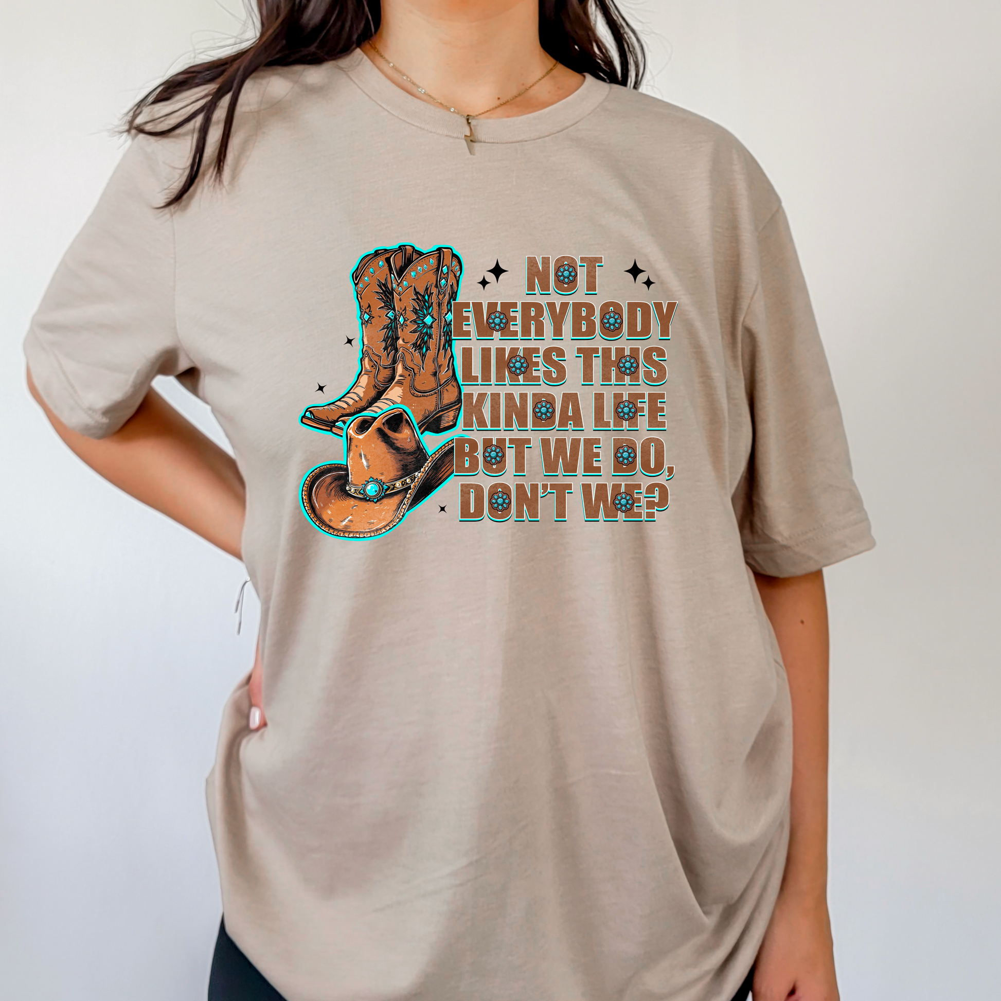 Celebrate the country life with this rustic Western tee! Featuring distressed lettering and a graphic of classic cowboy boots and hat, this shirt says it all: “Not everybody likes this kinda life, but we do, don’t we?” Perfect for rodeo lovers, ranchers, or anyone who thrives in the boots-and-dirt lifestyle. A great pick for fair season or casual days on the farm.