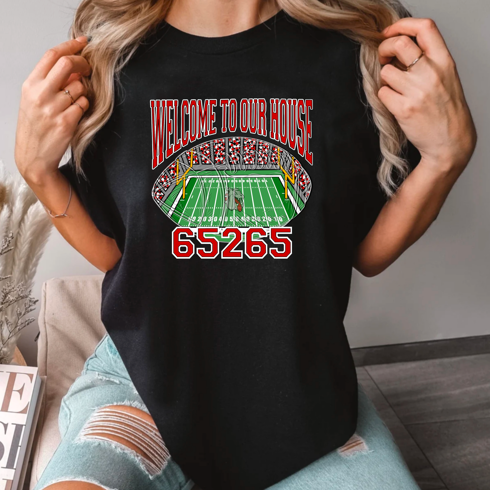 Rep your hometown pride with this bold “Welcome to Our House” football stadium tee featuring the 65265 zip code. Perfect for Bulldogs fans and locals who love Friday night lights and cheering from the stands. Great for game days, tailgates, or showing your red and black spirit year-round!