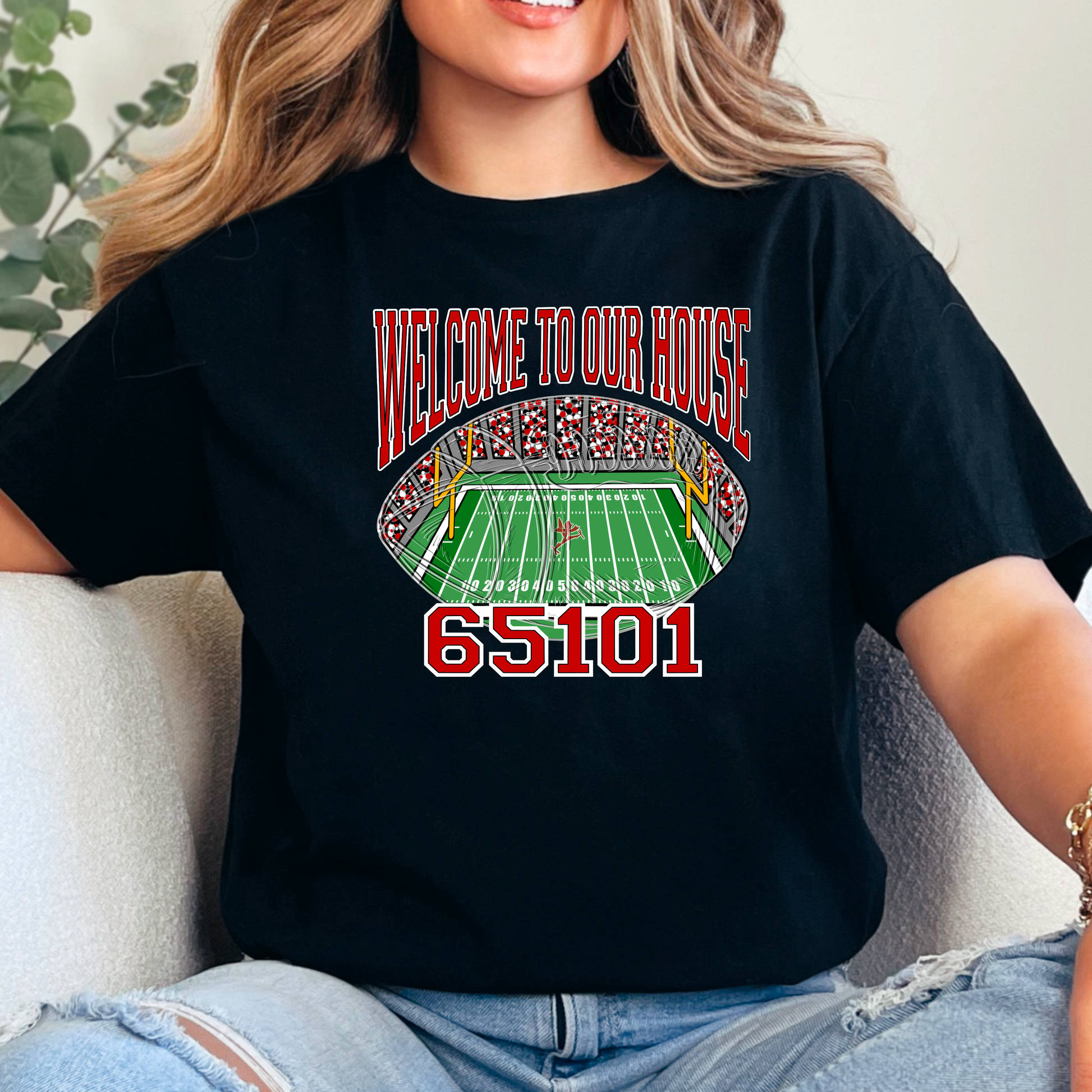 Show your hometown team pride with this striking “Welcome to Our House” football stadium tee featuring the 65101 zip code. Designed in bold black and red with checkered stands and a center field logo, this shirt is perfect for Friday night lights, pep rallies, and everyday school spirit wear.